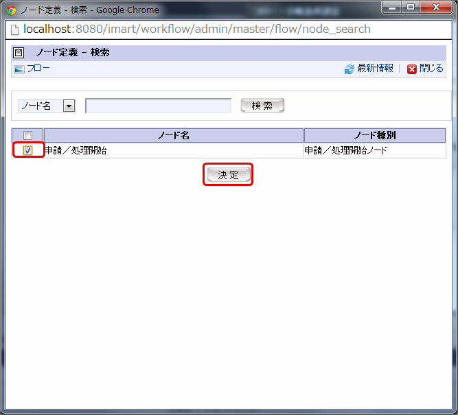 「ノード定義 - 検索」画面で、対象のノードを選択し、「決定」をクリックします。