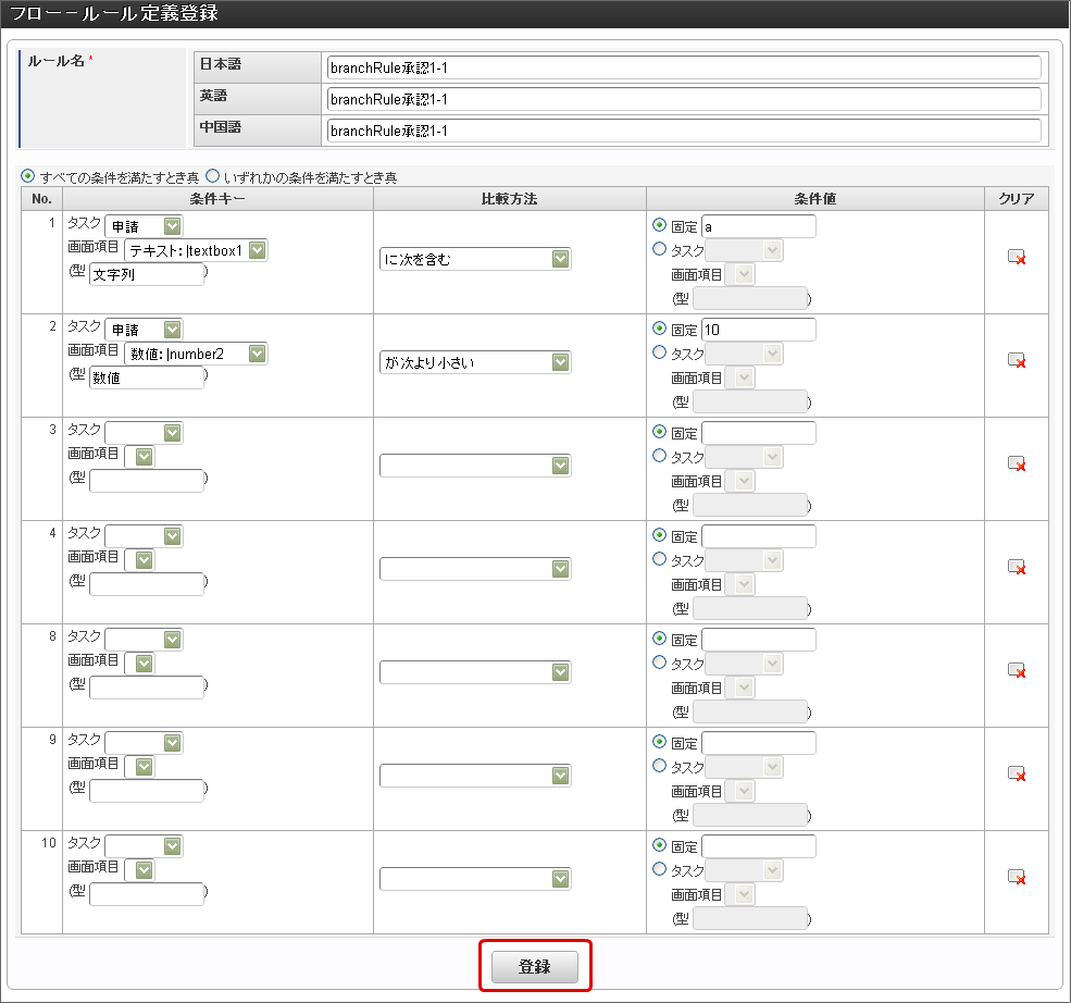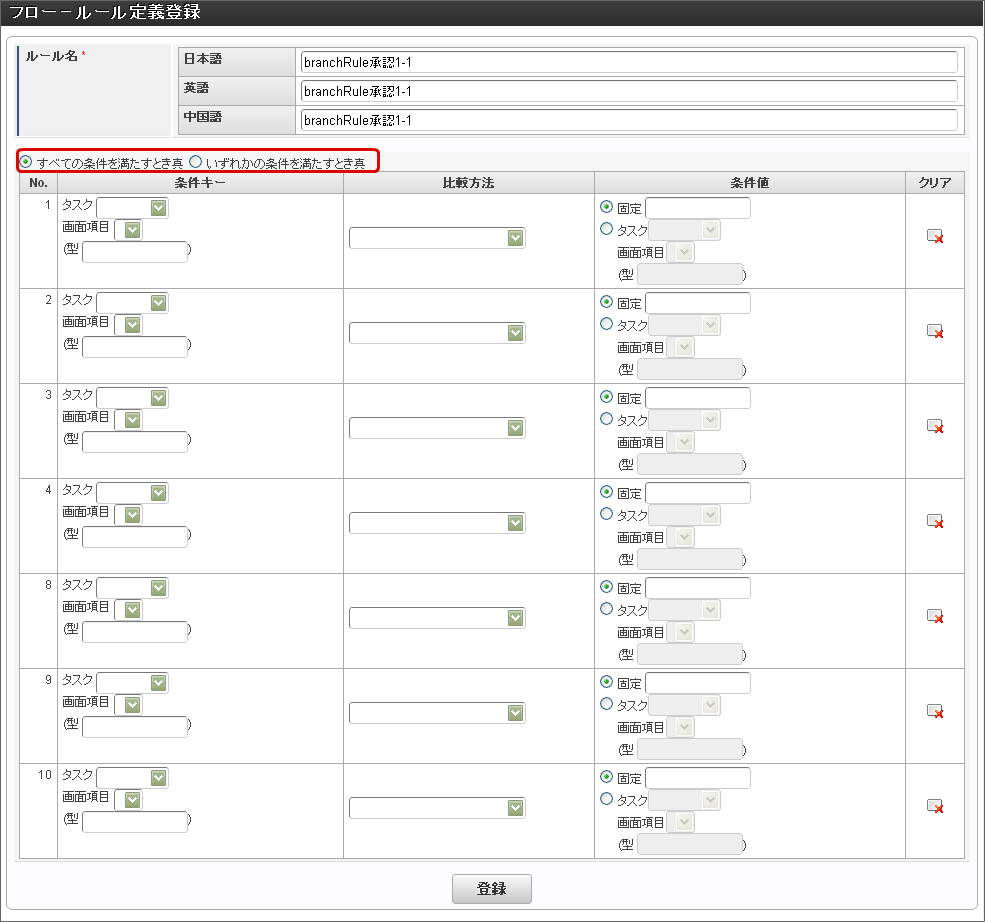 「フロー - ルール定義登録」画面で「条件キー」、「比較方法」、「条件値」を設定します。分岐先を実行するための条件を設定したら「登録」をクリックします。分岐開始ノードに設定した他の分岐先も同様に条件を設定します。