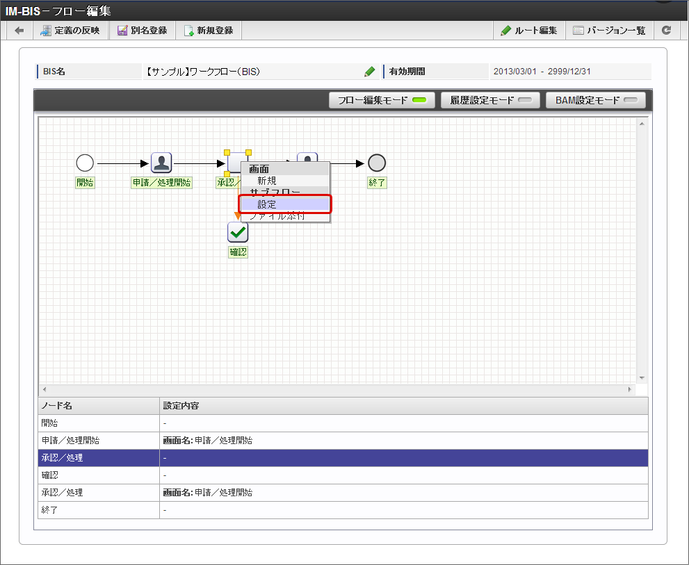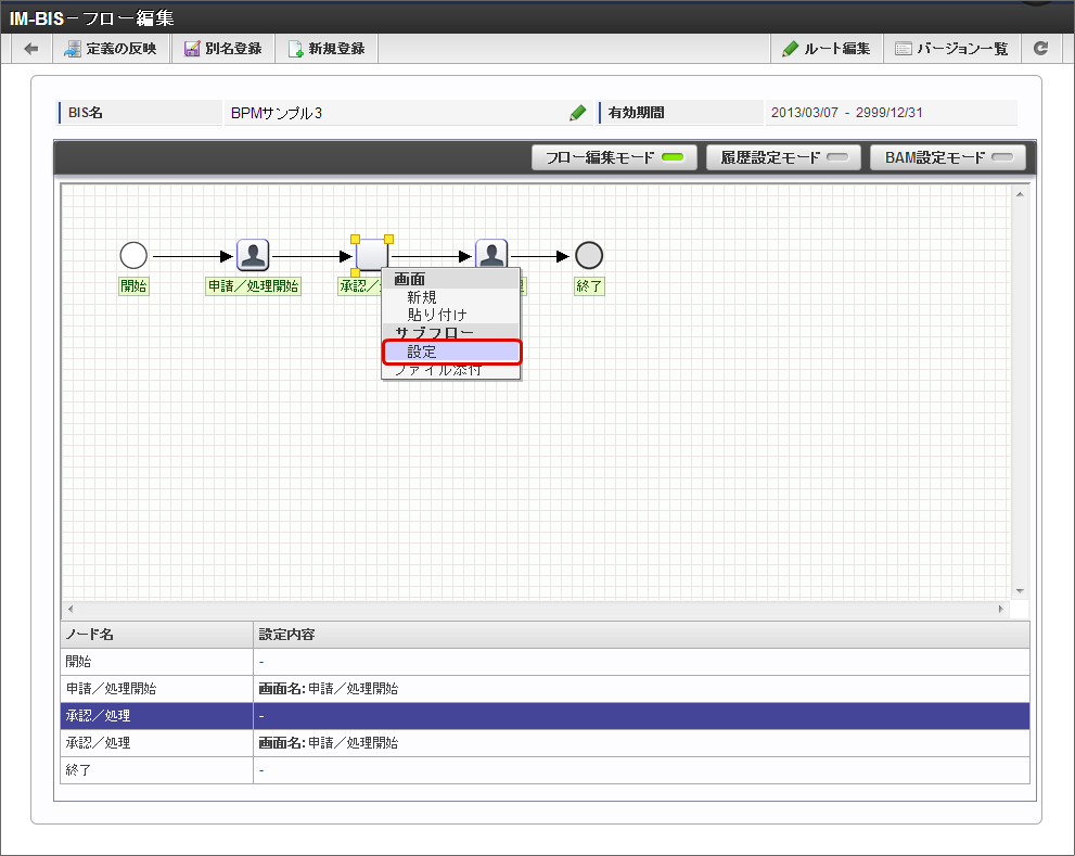 「IM-BIS - フロー編集」画面で、サブフローを設定する対象のタスクを右クリックし、「サブフロー」-「設定」をクリックします。