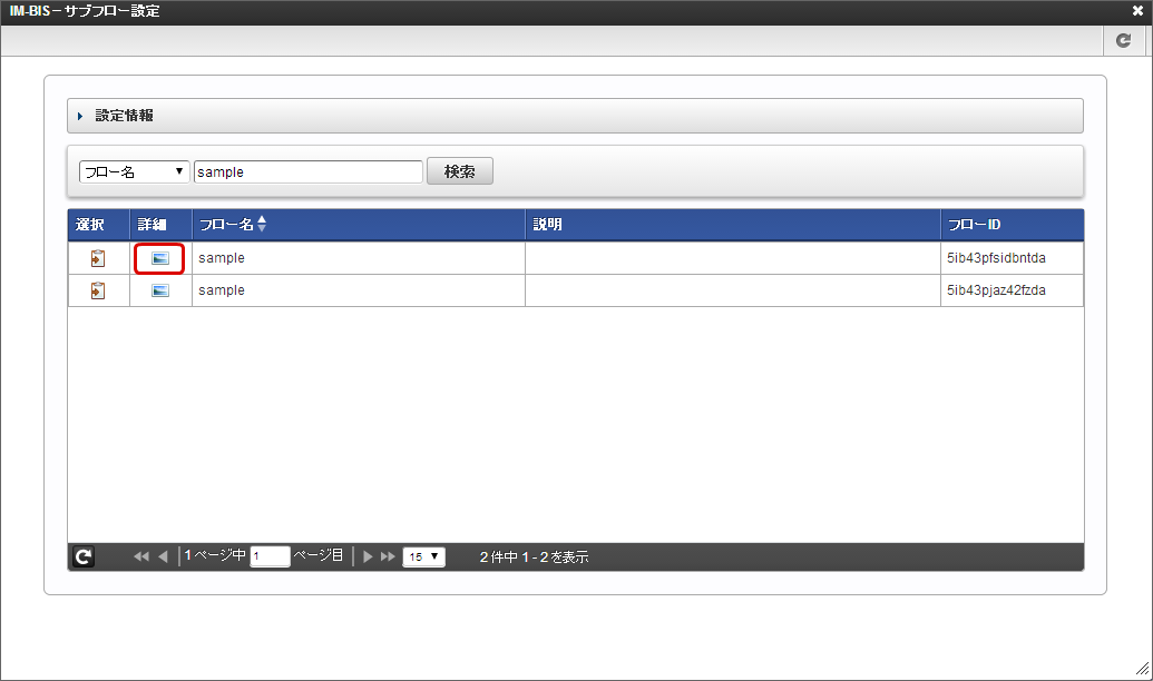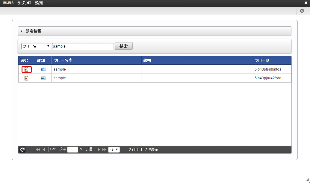 「IM-BIS -サブフロー設定」画面で利用するフローを検索します。