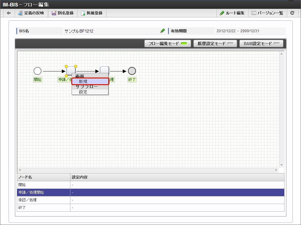 「IM-BIS - フロー編集」画面で、画面を設定するタスク(ノード)の上で右クリックし、「画面」→「新規」(登録済みの場合は「開く」)をクリックします。