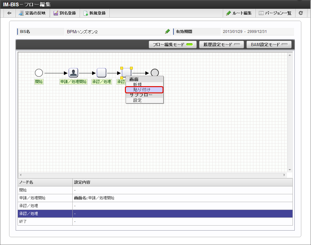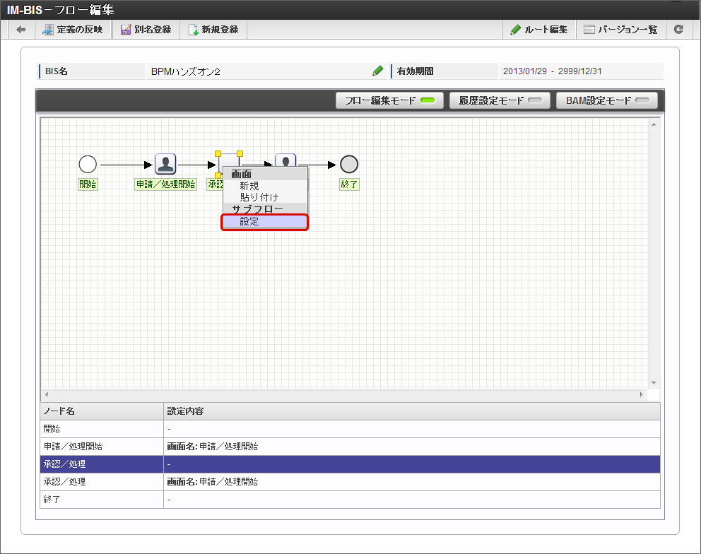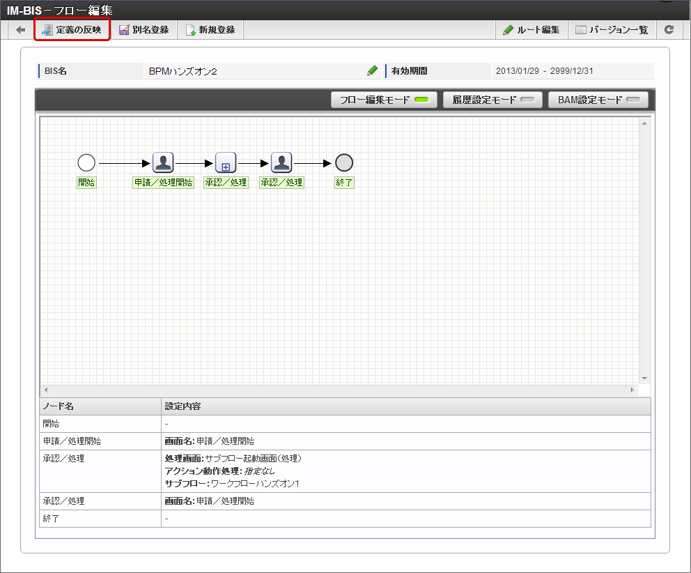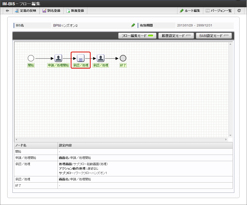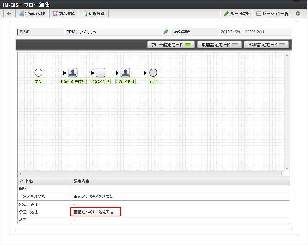 以上の手順で、BIS定義の基本情報が登録できました。作成したルートが保存できると、自動的に「IM-BIS - フロー編集」画面に遷移します。