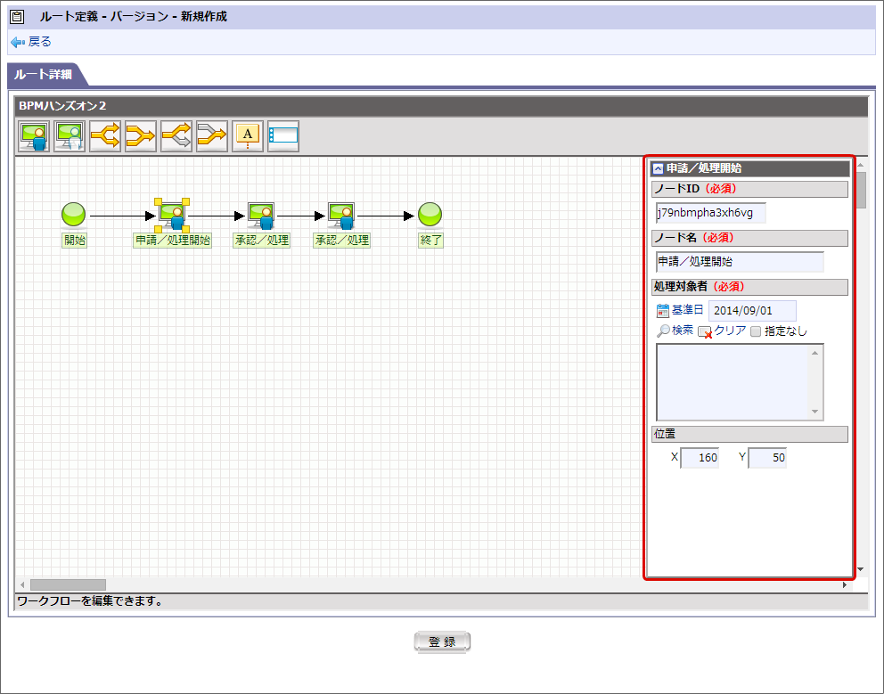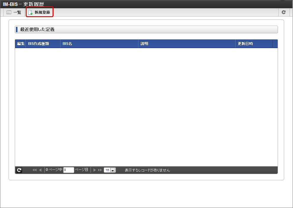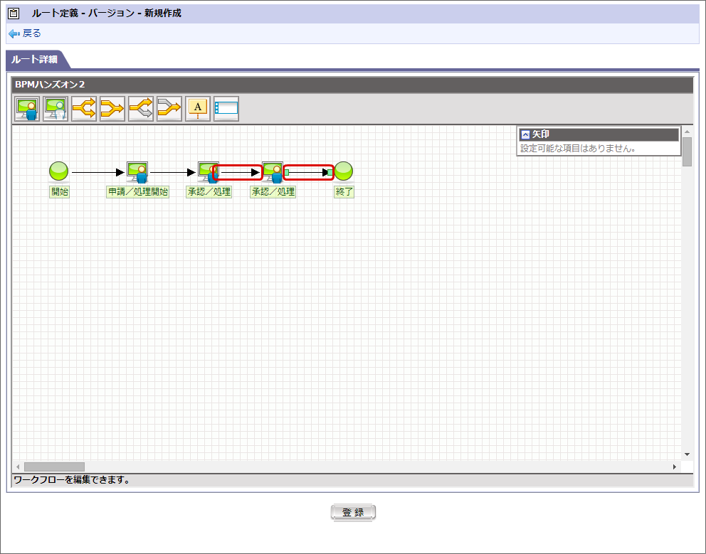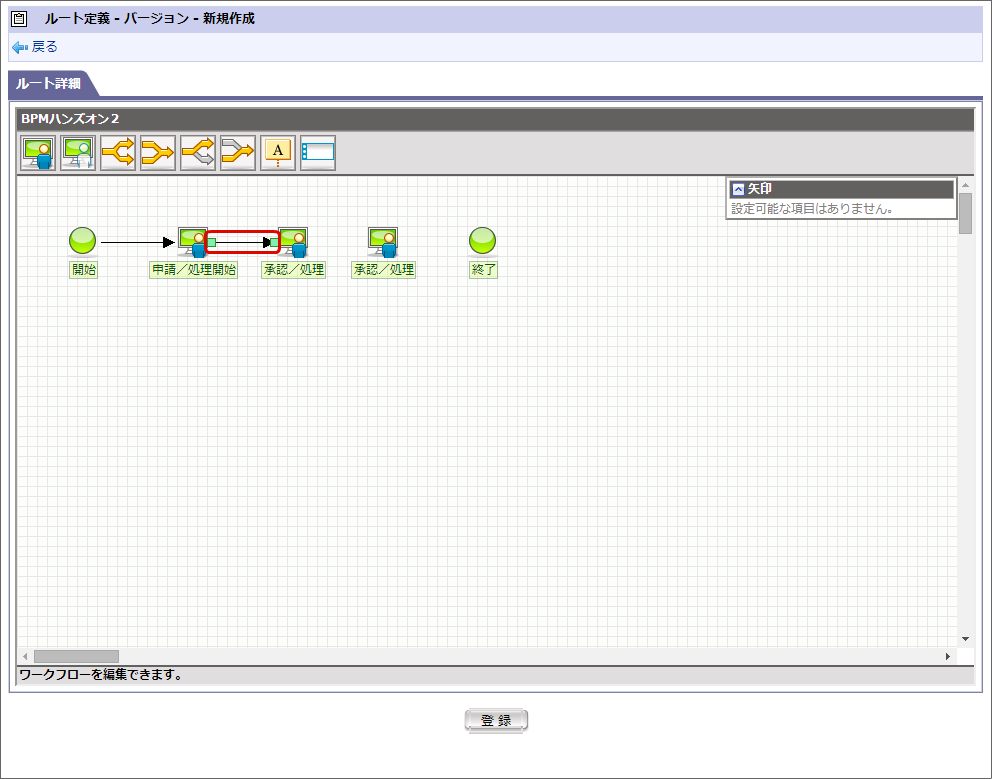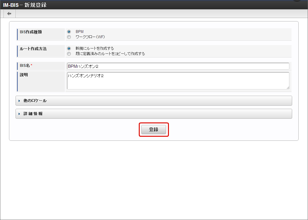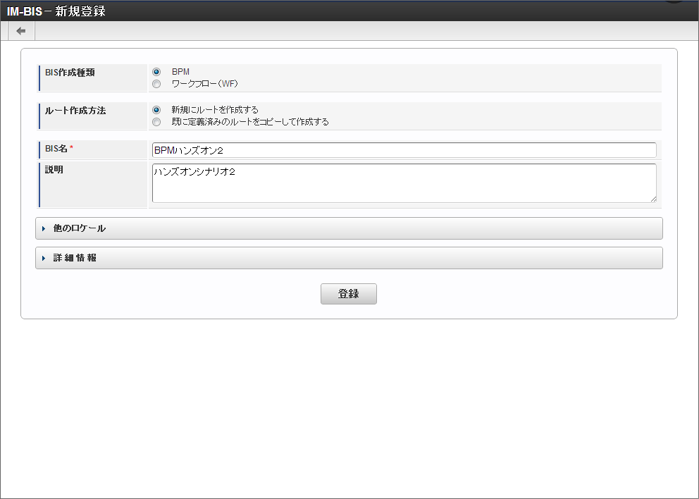 以上の手順で、BIS定義の基本情報が登録できました。作成したルートが保存できると、自動的に「IM-BIS - フロー編集」画面に遷移します。