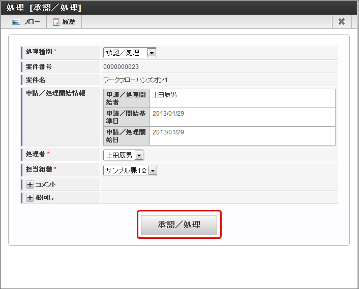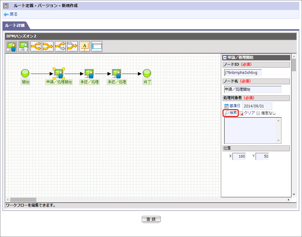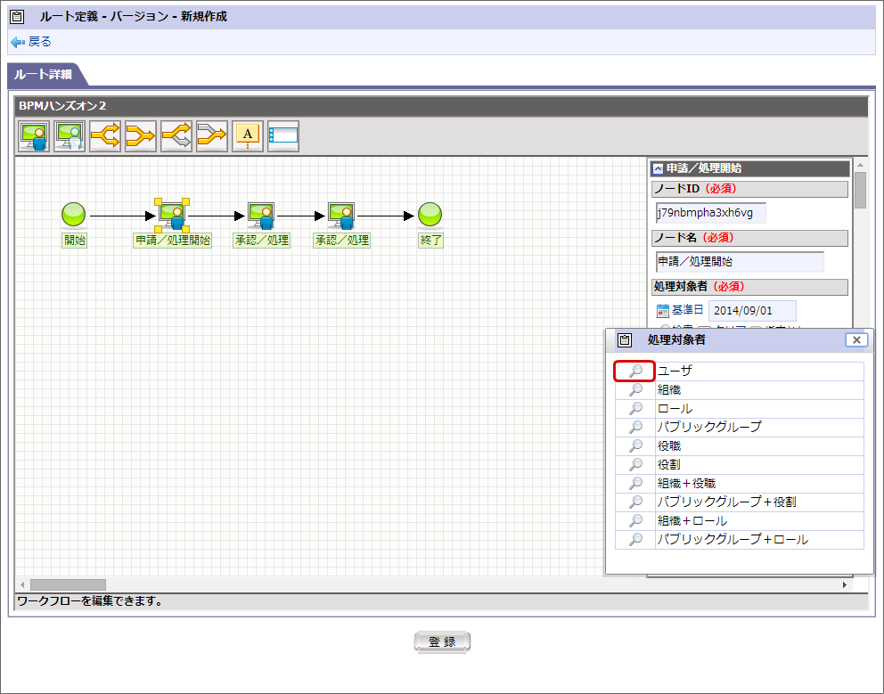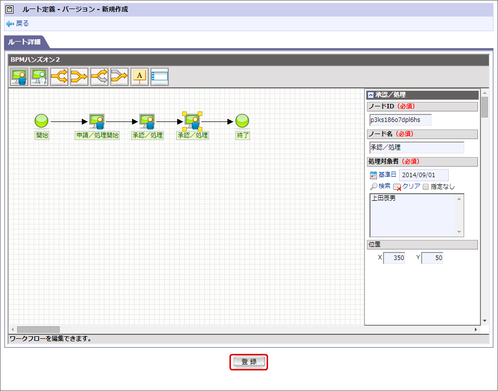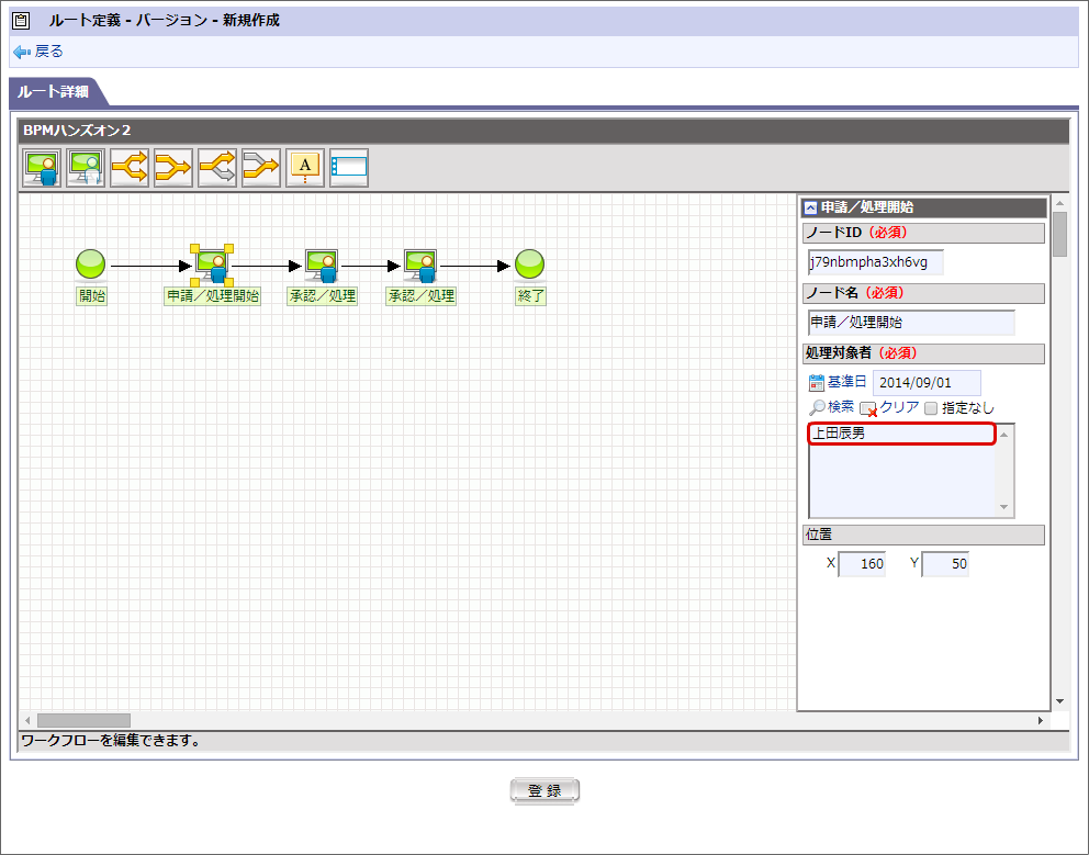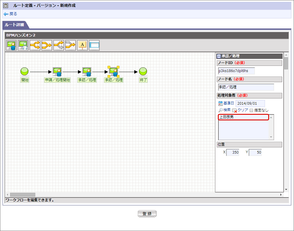 同様の手順で、「承認/処理」2つとも処理対象者に「上田辰男」を設定します。