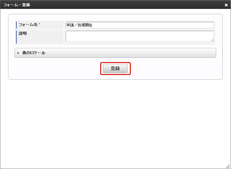 「IM-BIS - フロー編集」画面で、「申請/処理開始」をダブルクリックします。(または、「申請/処理開始」を右クリックして表示されるコンテキストメニューで「画面」-「新規」をクリックします。)「フォーム登録」画面が表示されますので、「フォーム名」、「説明」を入力し、「登録」をクリックします。