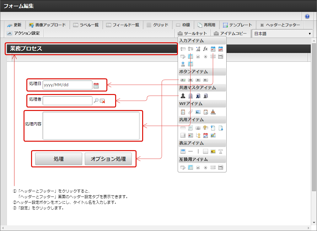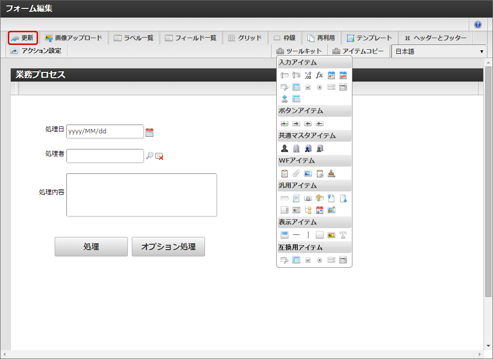 「ツールキット」から画面アイテムをドラッグ&ドロップで配置し、以下のように「申請/処理開始」で表示する画面を作成します。