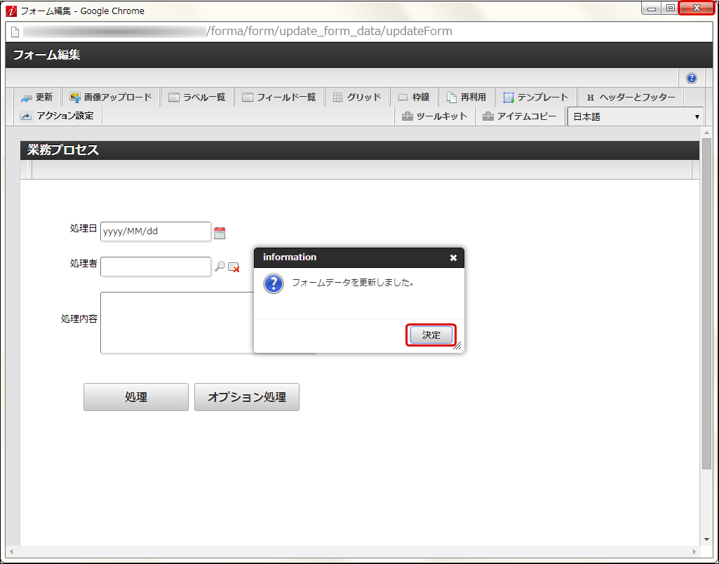 確認メッセージの「決定」をクリックし、右上の「×」で閉じます。
