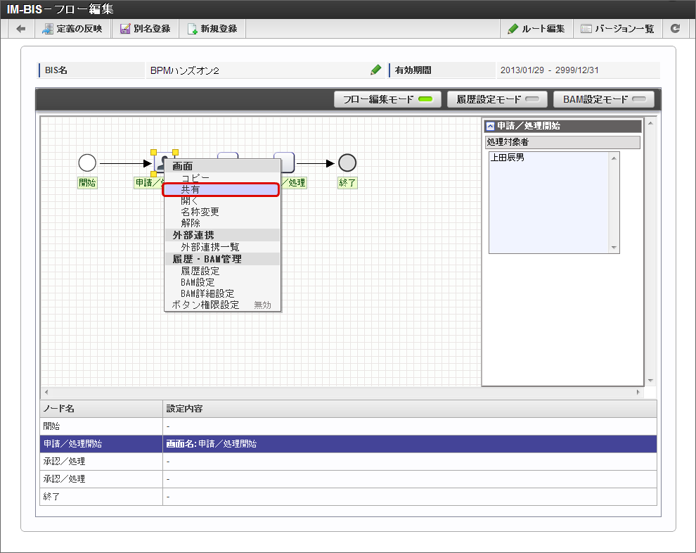 「申請/処理開始」の画面を「承認/処理」の画面でも利用するために、コンテキストメニューで「画面」-「共有」をクリックします。