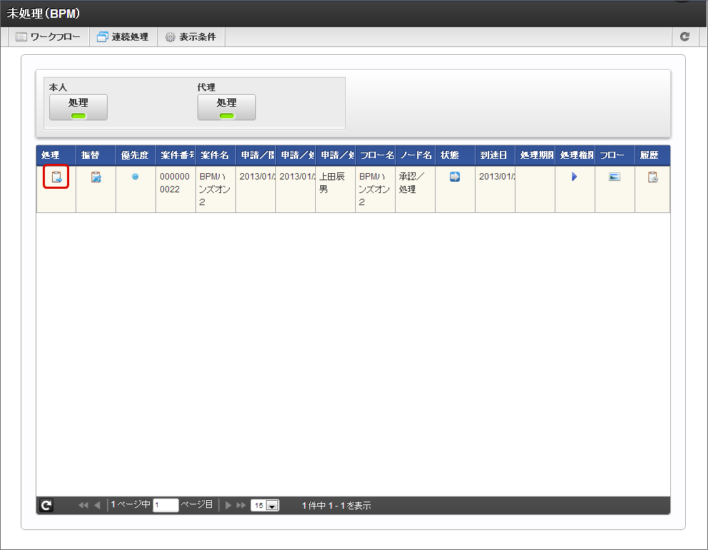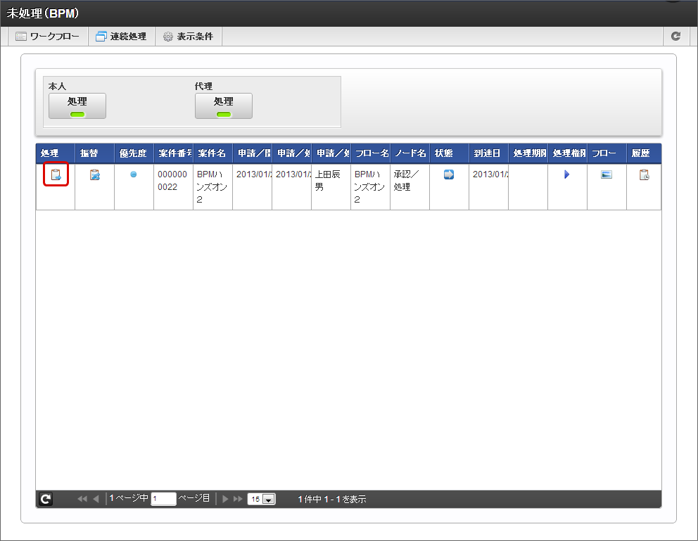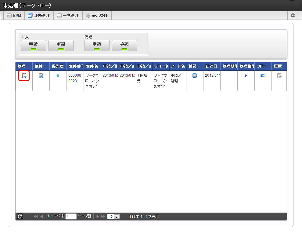 「未処理(ワークフロー)」画面から先ほど処理を行った案件を確認し、「処理」をクリックします。