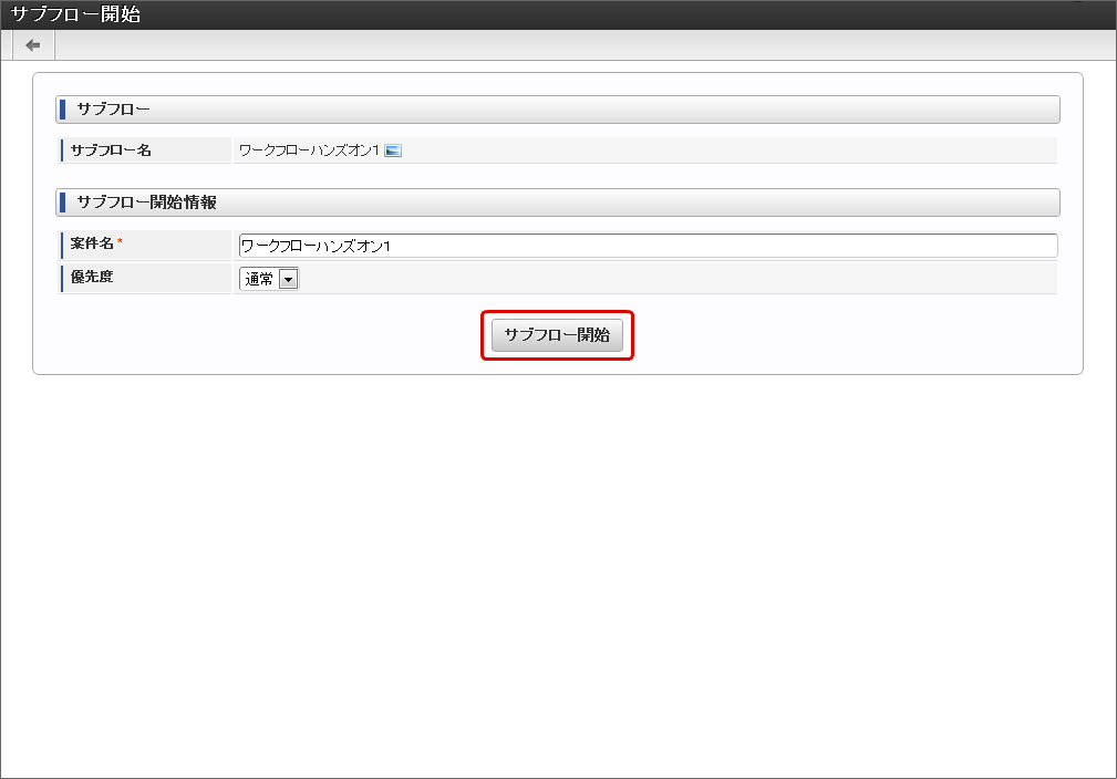 「サブフロー開始」画面では、サブフロー開始情報の内容を確認し、「サブフロー開始」をクリックします。