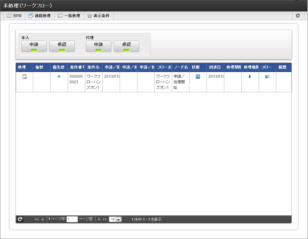 メインフローでサブフローを設定したノード(タスク)の処理対象者でログインし、BISフローの未処理からこのシナリオで処理を行った案件の「処理」をクリックします。