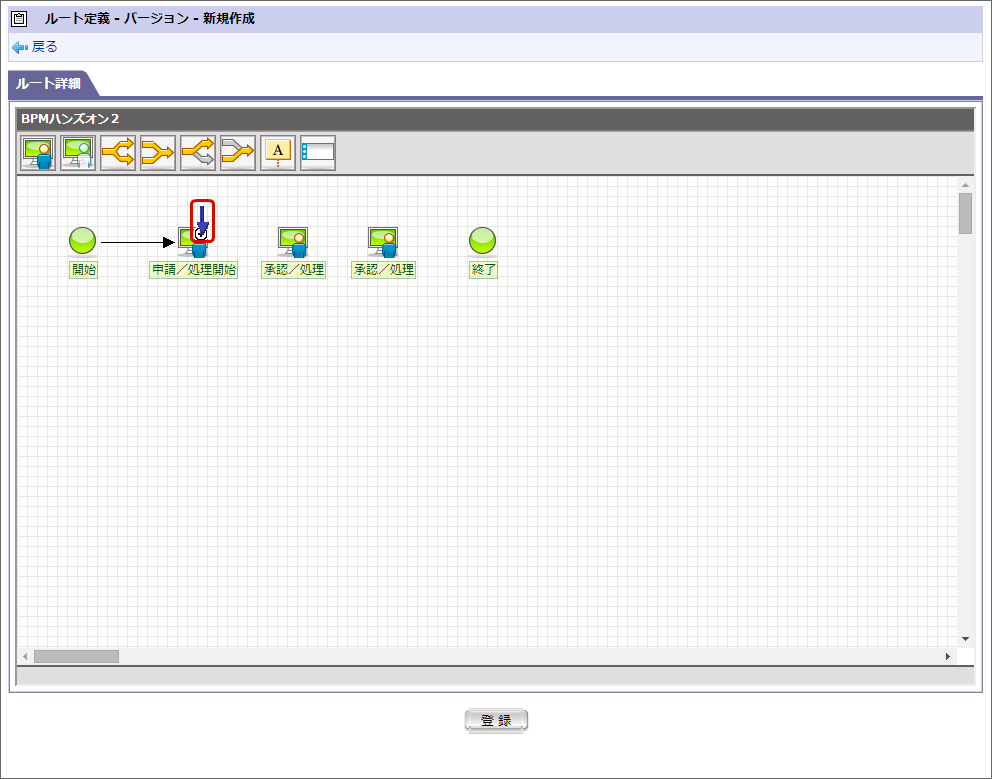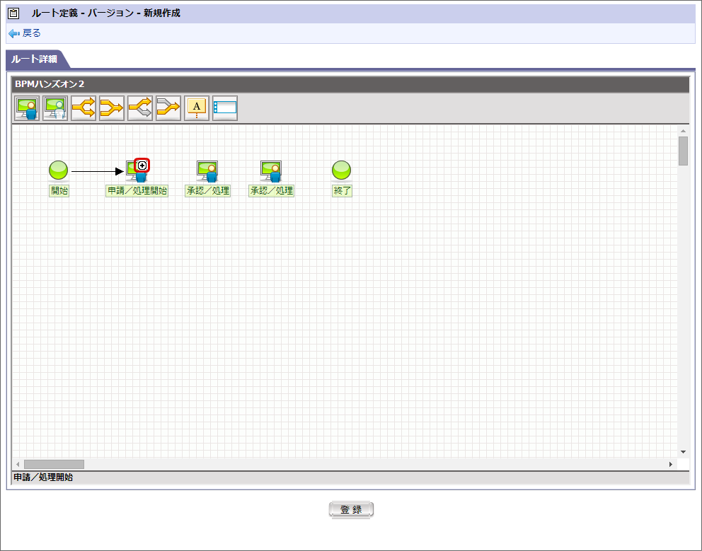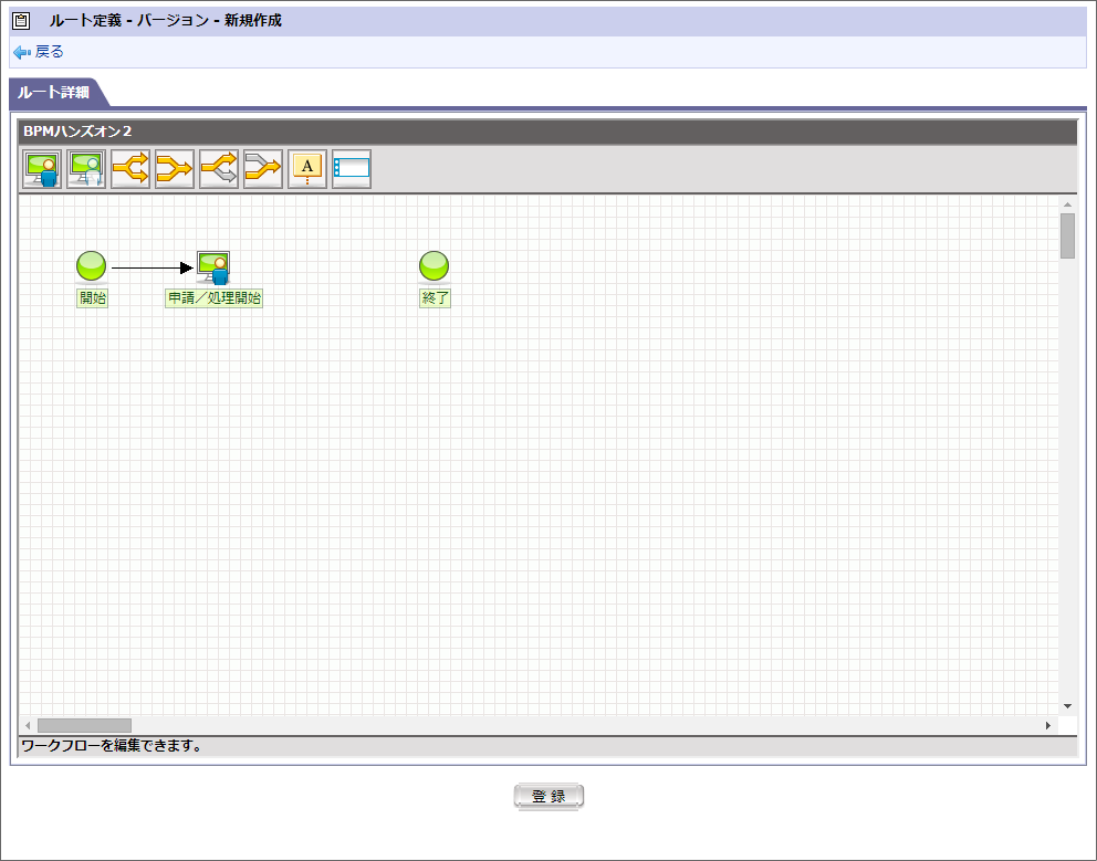 「ルート定義 - バージョン - 新規作成」画面では、「開始」、「申請/処理開始」、「終了」が配置済みです。