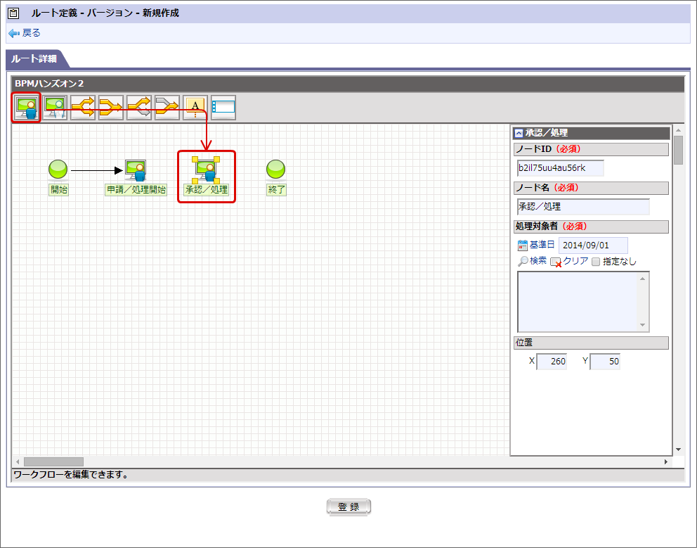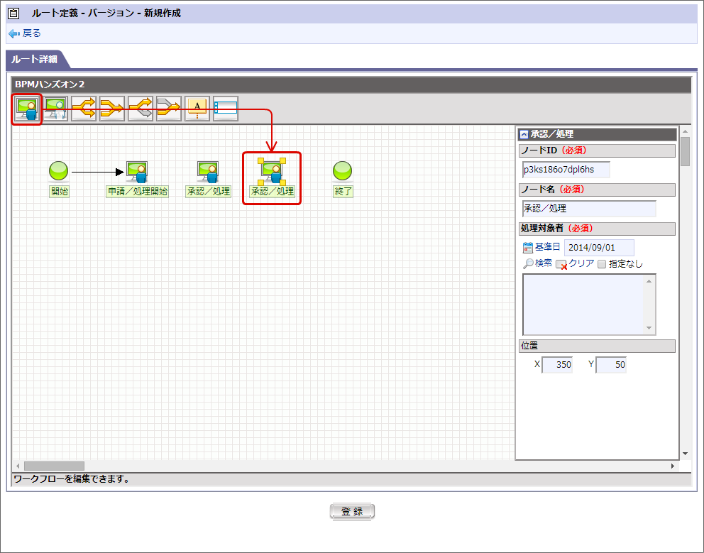 矢印の先を「承認/処理」でドロップすると、ノードとノードが接続されます。