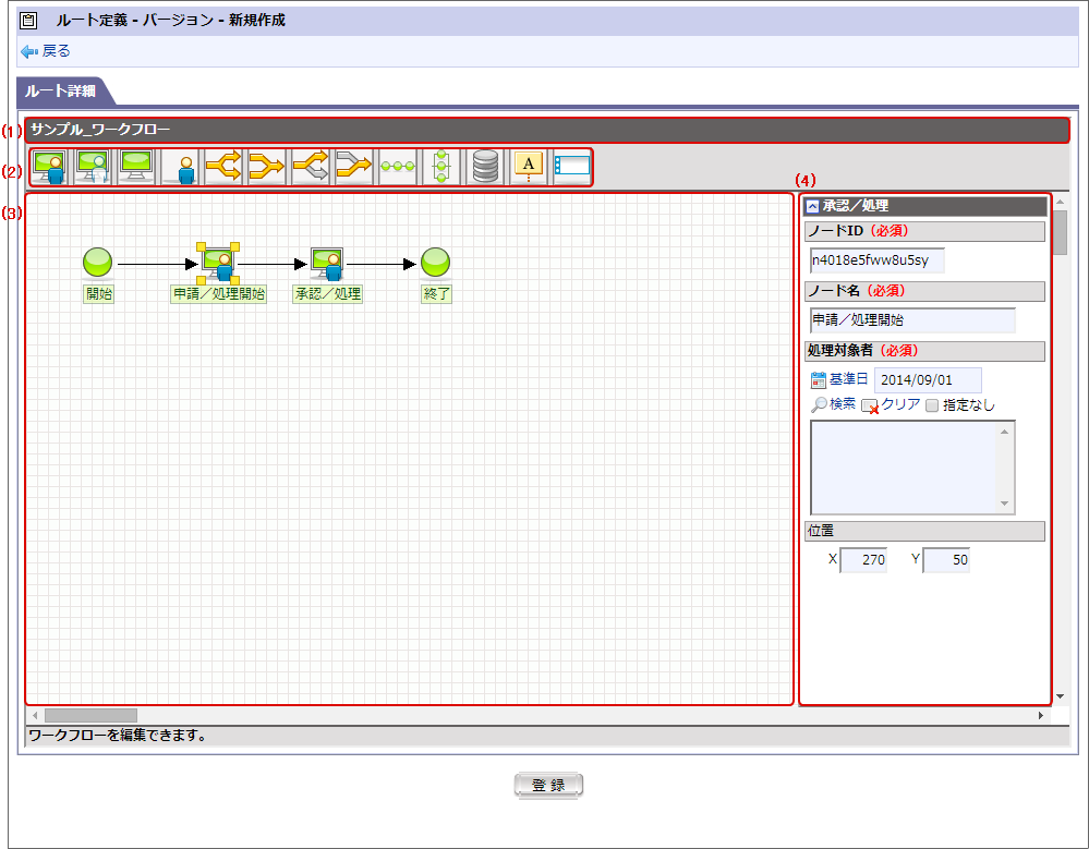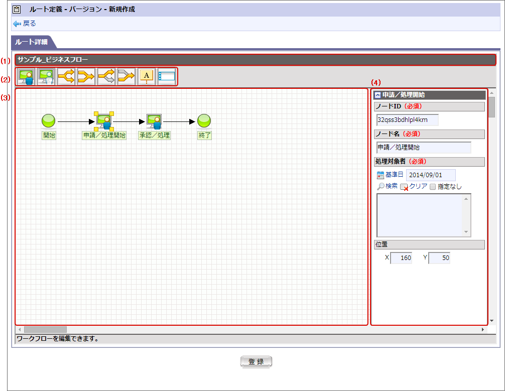 ルートを作成するための作業領域です。配置したノードアイコン間をマウス操作で接続することで処理の流れを設定します。開始・終了・申請の各ノードは最初から配置済みです。