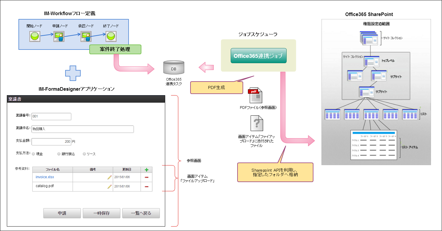 「 Office 365 ファイル連携」は、Office 365(SharePoint)へファイルのアップロードを行うことができる機能です。この機能は、IM-FormaDesigner for Accel Platform および IM-BIS for Accel Platform の案件終了後に連携ジョブにて、 以下のファイルを Office 365 にアップロードできます。