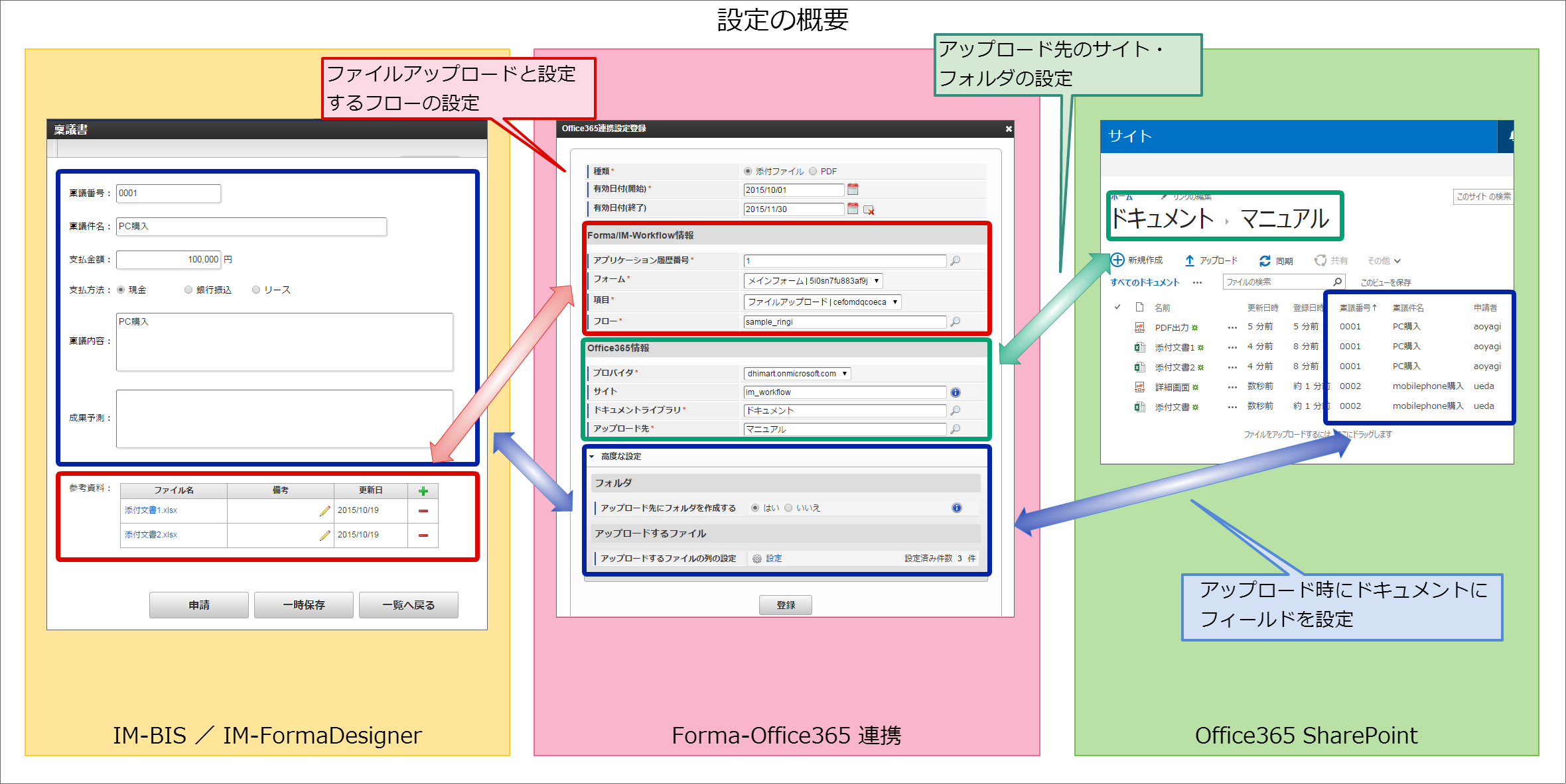 Office 365 連携の設定では、IM-BIS、Office 365、Forma - Office 365 連携設定を順に設定します。 各機能と設定の関連は、以下の図のようになります。