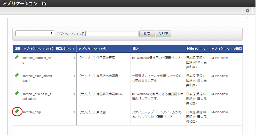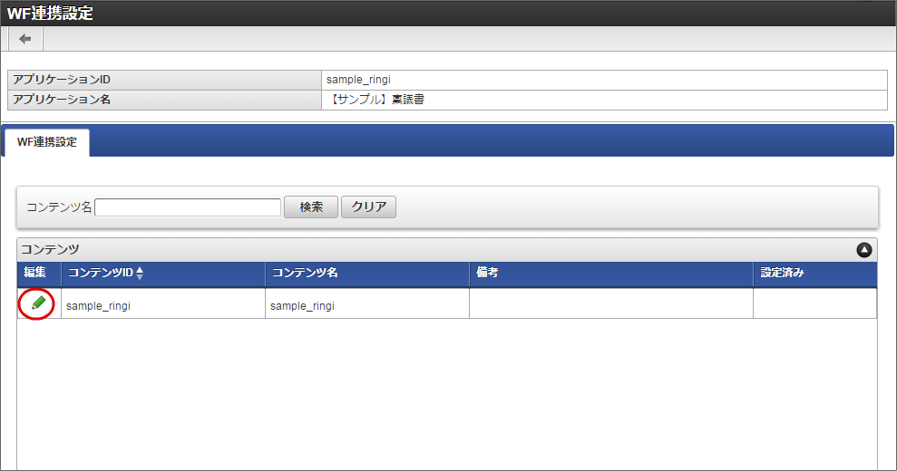 アプリケーションから生成済みのコンテンツ定義が表示されますので、「編集」をクリックします。