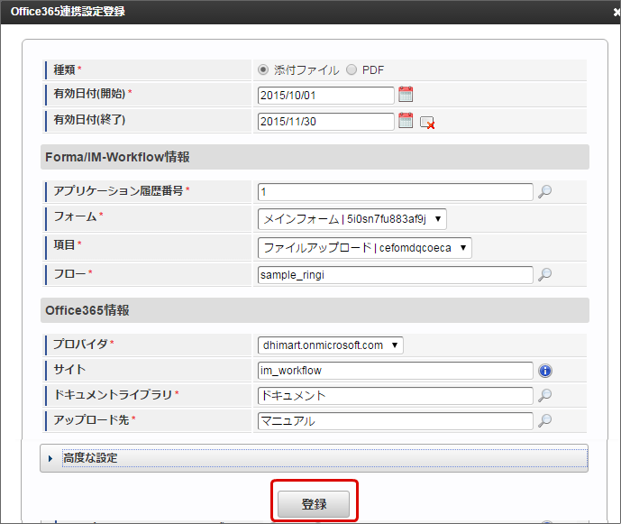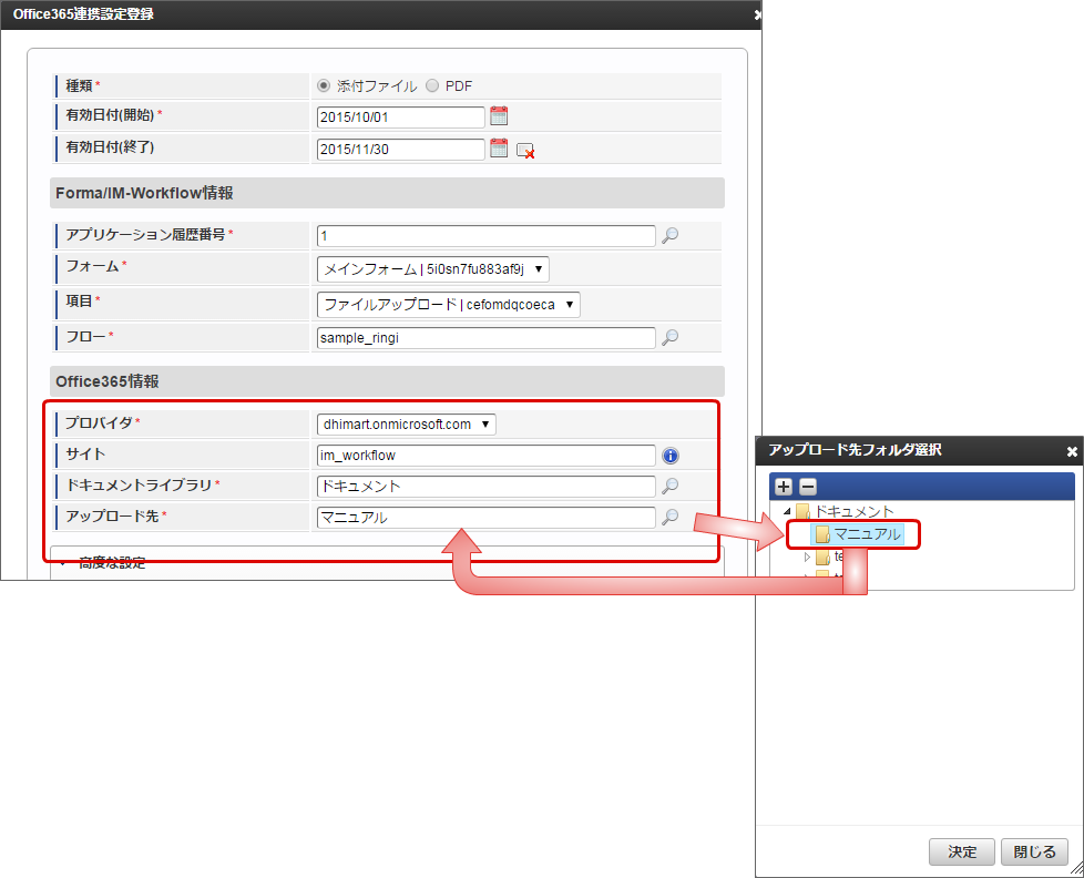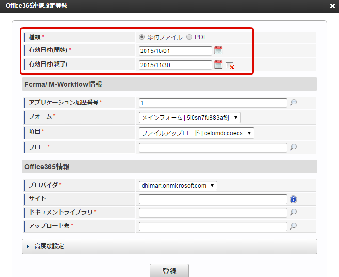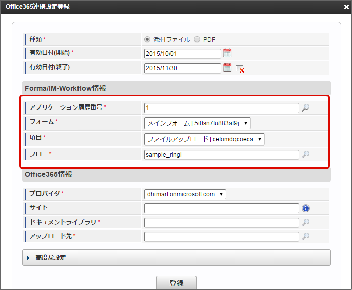 有効期間は、案件終了時に判定します。案件終了時に「 Office 365 連携設定」を参照し、有効期間内であれば、 Office 365 ファイルアップロードジョブの実行対象です。 種類・有効期間以外の「 Office 365 連携設定」は、 Office 365 ファイルアップロードジョブの実行時点の情報で Office 365 へ連携されます。 「Forma/IM-Workflow情報」で、アプリケーション履歴番号・対象のフォーム・フォーム上のファイルアップロードアイテム・対象のフロー定義を指定します。