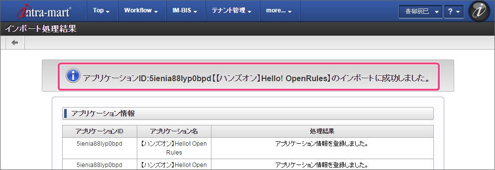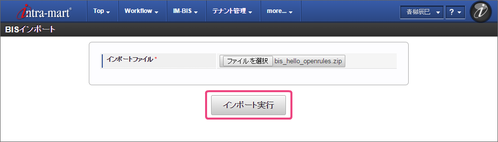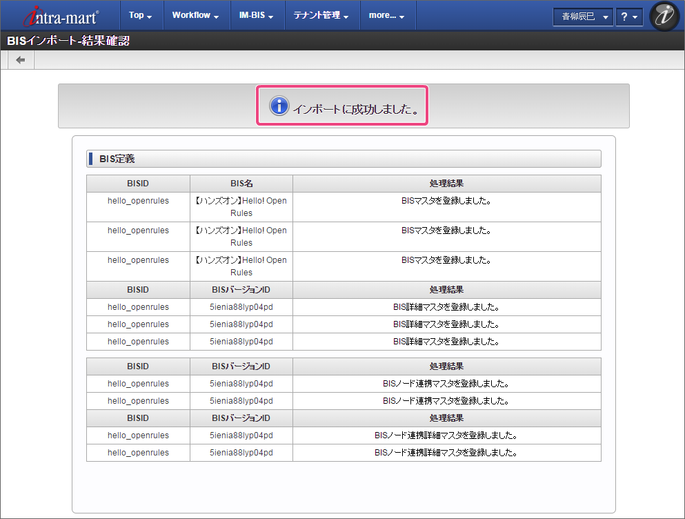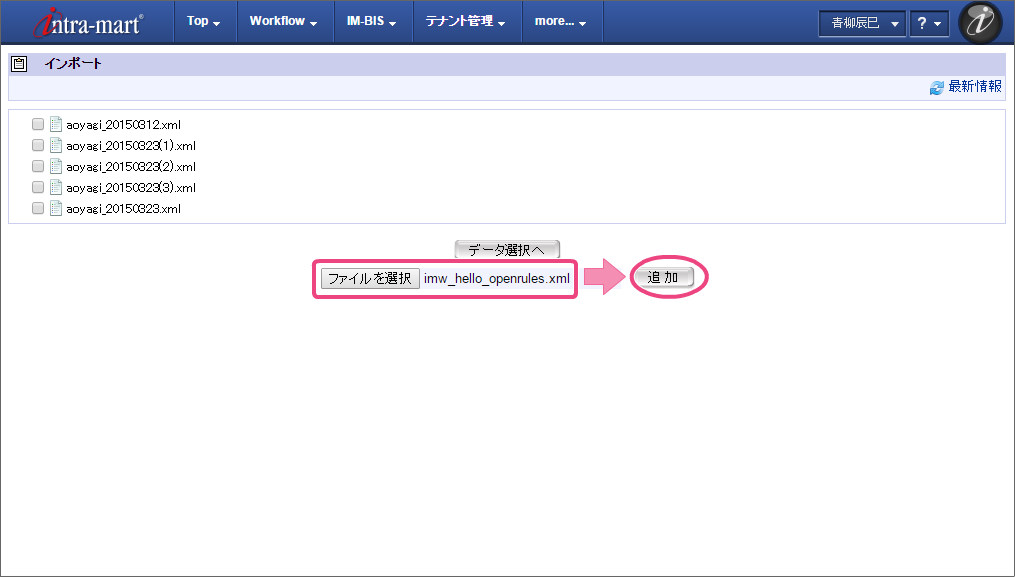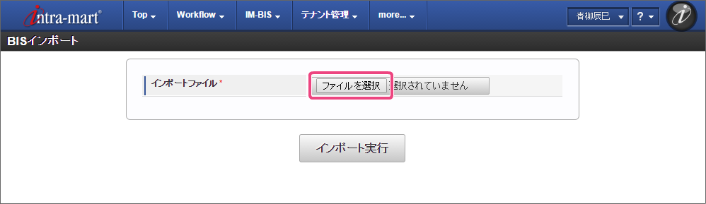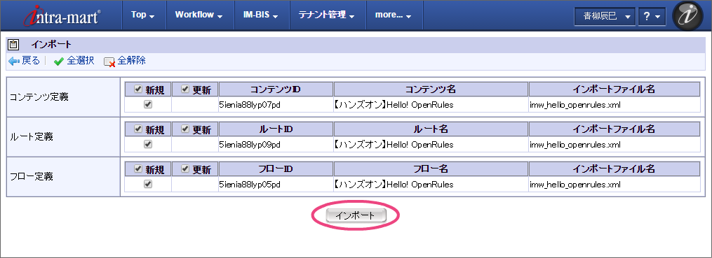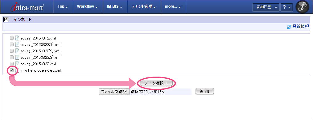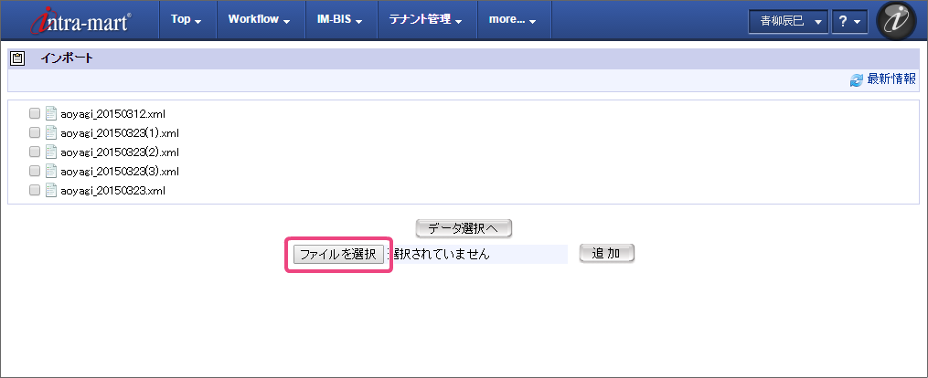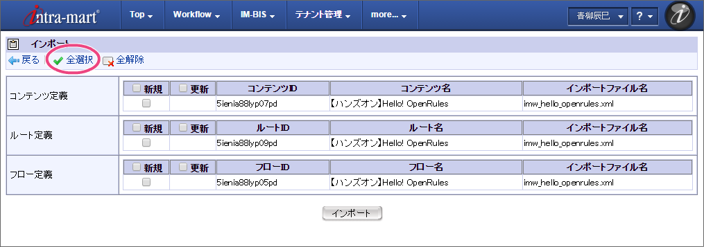 当ガイドから対象のファイルをダウンロードしてください。 ダウンロードしたZipファイルを解凍してください。 サイトマップの「 IM-BIS 」から「 IM-Workflowインポート」をクリックしてください。 「ファイルを選択」をクリックし、先ほど解凍したファイルに含まれているXMLファイルを指定してください。 追加したXMLファイル名が表示されていることを確認し、「追加」をクリックしてください。 追加したファイルのチェックボックスをオンにし、「データ選択へ」をクリックしてください。 「全選択」をクリックしてください。 「インポート」をクリックしてください。 以下のように表示されたら、 IM-Workflow の定義ファイルが正常にインポートできました。
