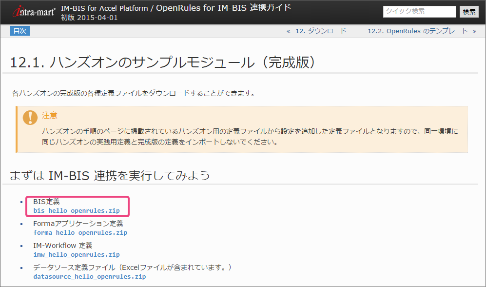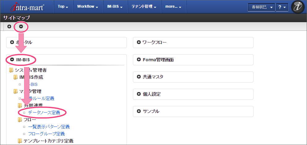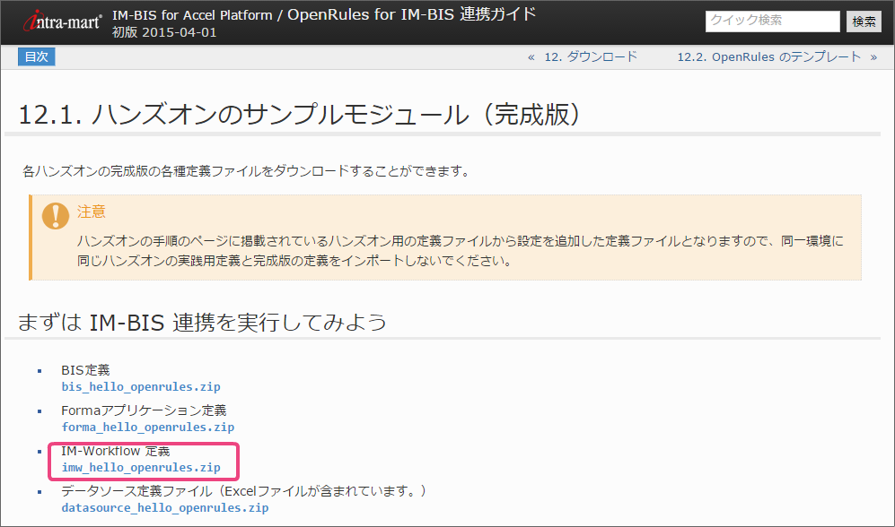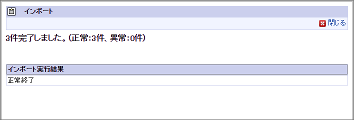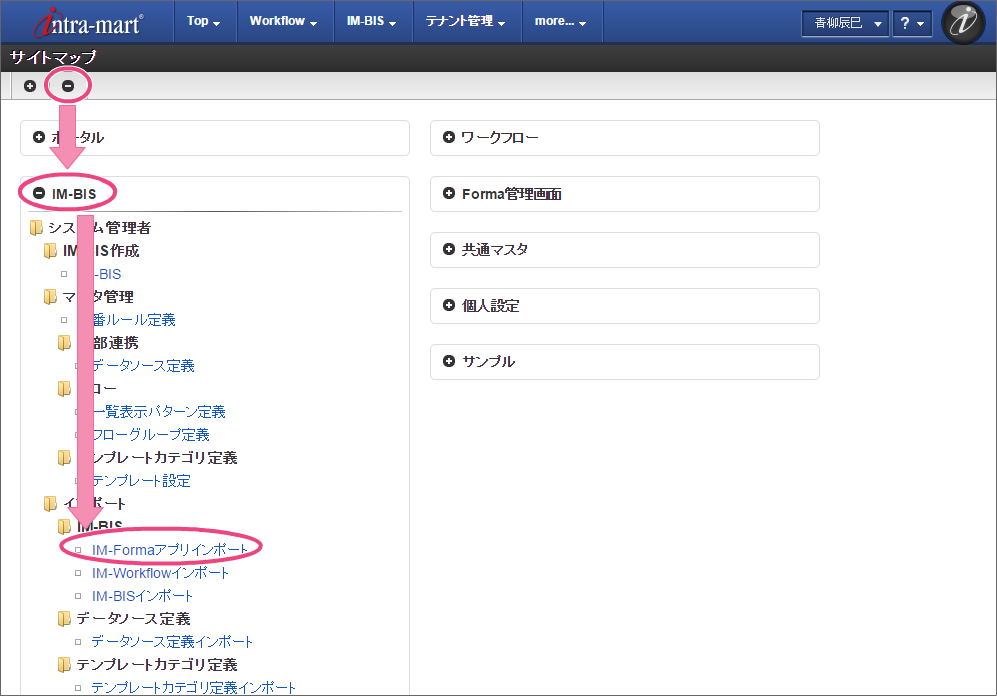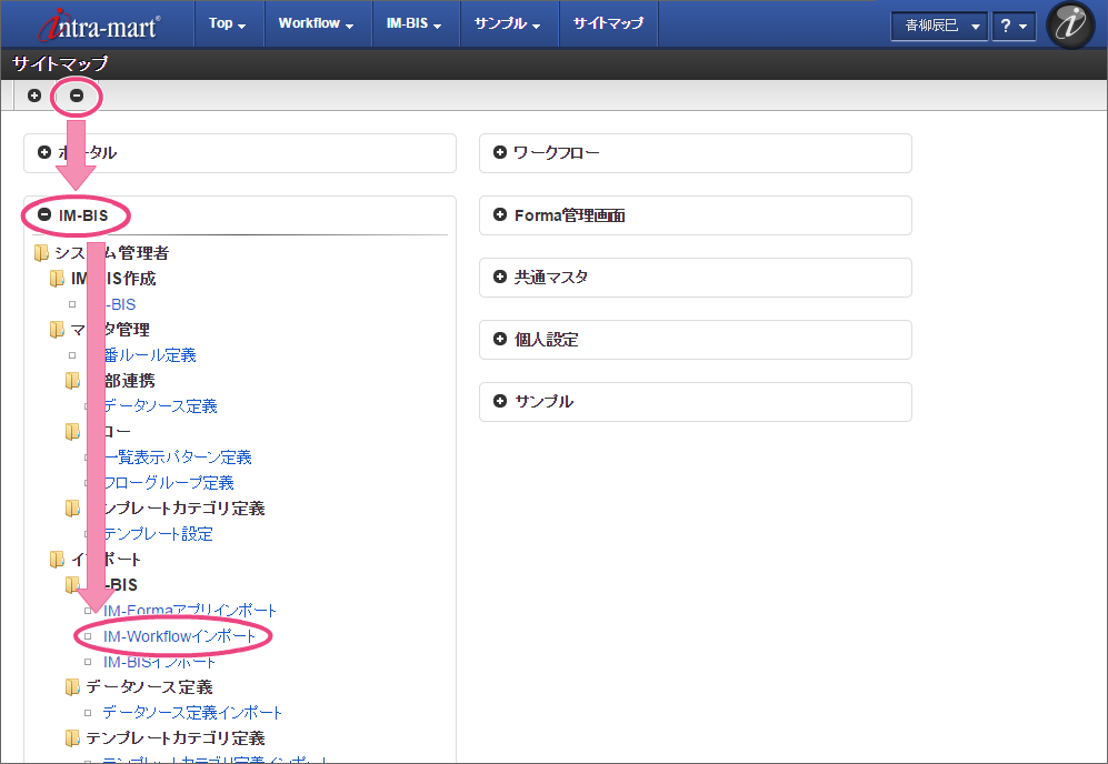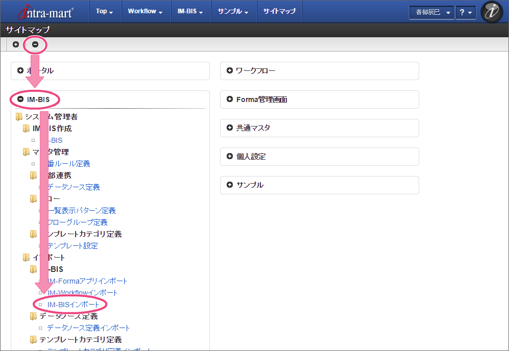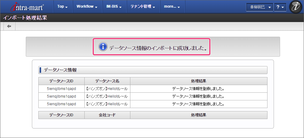 当ガイドから対象のファイルをダウンロードしてください。 ダウンロードしたZipファイルを解凍してください。 サイトマップの「 IM-BIS 」から「 IM-Workflowインポート」をクリックしてください。 「ファイルを選択」をクリックし、先ほど解凍したファイルに含まれているXMLファイルを指定してください。 追加したXMLファイル名が表示されていることを確認し、「追加」をクリックしてください。 追加したファイルのチェックボックスをオンにし、「データ選択へ」をクリックしてください。 「全選択」をクリックしてください。 「インポート」をクリックしてください。 以下のように表示されたら、 IM-Workflow の定義ファイルが正常にインポートできました。