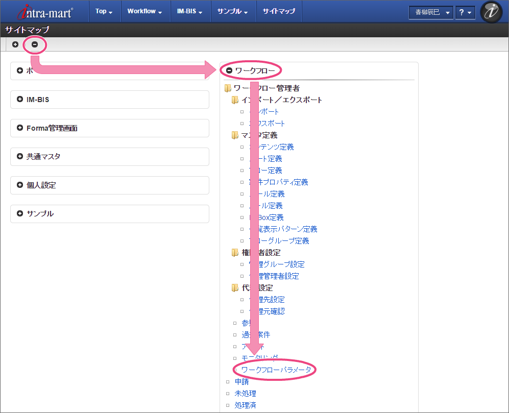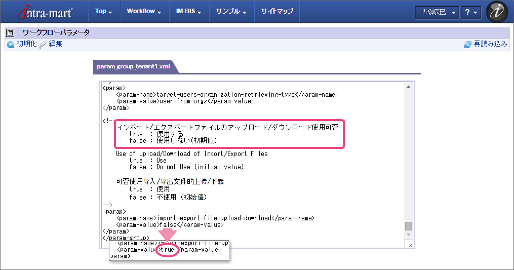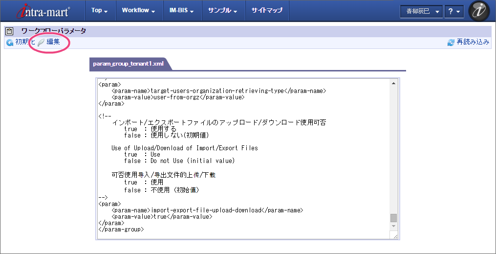 「BIS管理者ロール」を持ったユーザでログインしてください。 サイトマップの「ワークフロー」から「ワークフローパラメータ」をクリックしてください。 「ワークフローパラメータ」で「インポート/エクスポートファイルのアップロード/ダウンロード使用可否」の設定値を「false」から「true」に変更してください。 「編集」をクリックして変更内容を保存してください。 これで、ローカルから IM-Workflow の定義ファイルをインポートする準備が整いました。