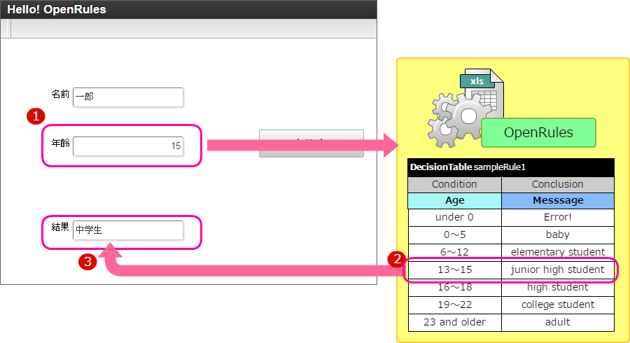 【図の説明】 年齢の入力後、ルールを実行します。 条件を評価し、合致する条件の処理を実行します。 ルールエンジンから受け取った内容を表示します。