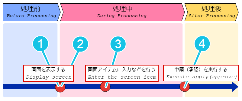 前処理 画面の表示前に行われる処理です。 初期表示イベント 画面を表示するタイミングで行われる処理です。 アイテムイベント、テーブルイベント 画面上のアイテムへの入力などによって行われる処理です。 後処理 申請や承認の実行後に行われる処理です。