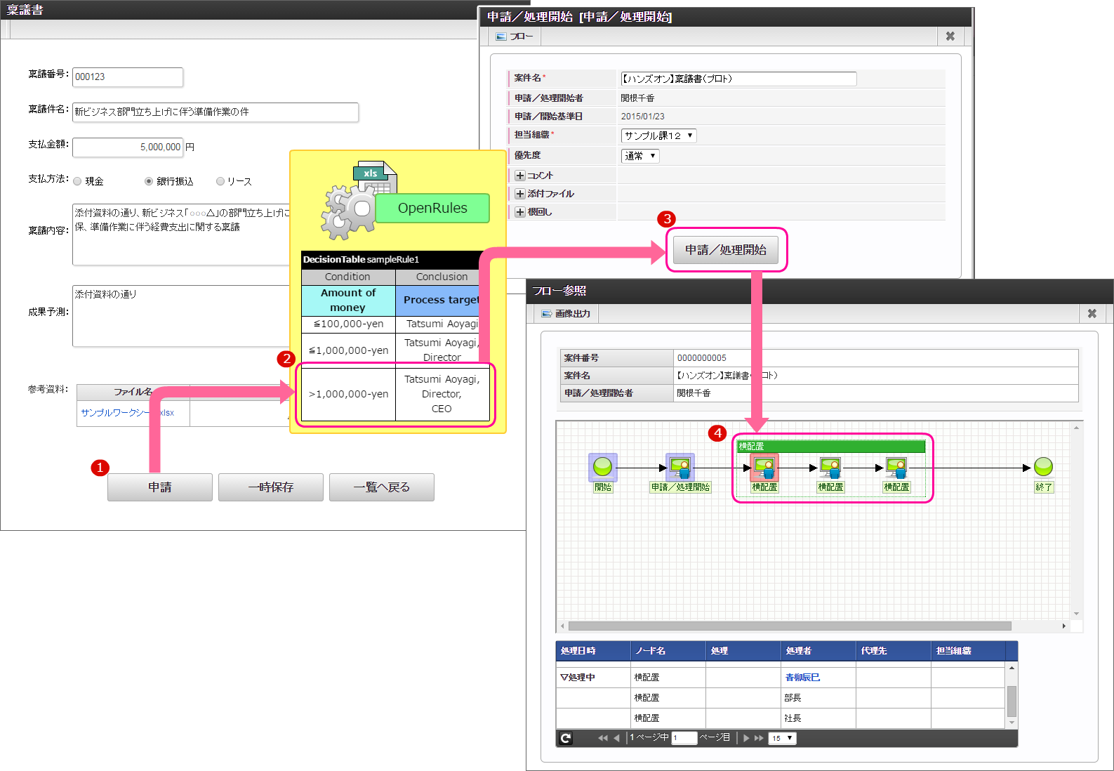 必要な内容を入力して申請を行います。 条件を評価し、合致する条件の組織を処理対象者として返却します。 内部で自動的に後続のノードの処理対象者に返却された処理対象者を設定して申請を実行します。 ルールエンジンの実行結果に基づいて横配置ノードの処理対象者が展開されます。