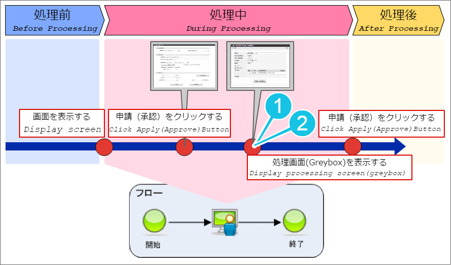 IM-BIS の連携は、以下のタイミングで処理を実行します。 【図の説明】 処理対象者の検索の絞り込み条件 標準処理画面(greybox)での処理対象者検索に対して暗黙の検索条件を設定します。 動的処理対象者の設定 動的承認ノードや縦配置・横配置ノードへ処理対象者を自動的に設定します。