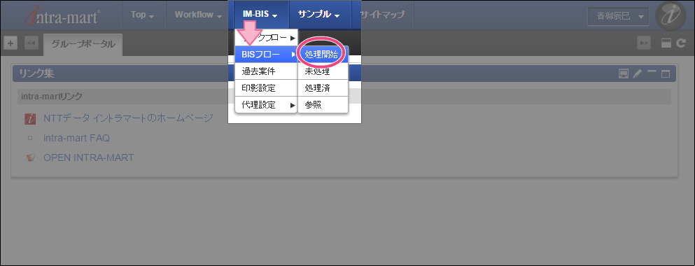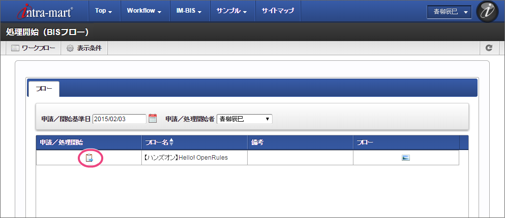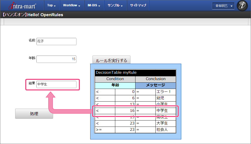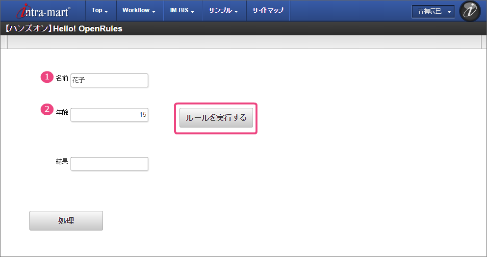 「BIS担当者」ロールを付与したユーザでログインしましょう。 (このマニュアルでは、「青柳辰巳」(ユーザコード:aoyagi)でログインします。) 上部のメニューの「 IM-BIS 」→「BISフロー」の順にマウスを重ねてから「処理開始」をクリックしてください。 「【ハンズオン】Hello! OpenRules」の「 申請/処理開始」をクリックしてください。 (1) 名前と(2) 年齢に任意の値を入力し、「ルールを実行する」をクリックしてください。 入力した年齢に応じた結果が返却されることが確認できました。