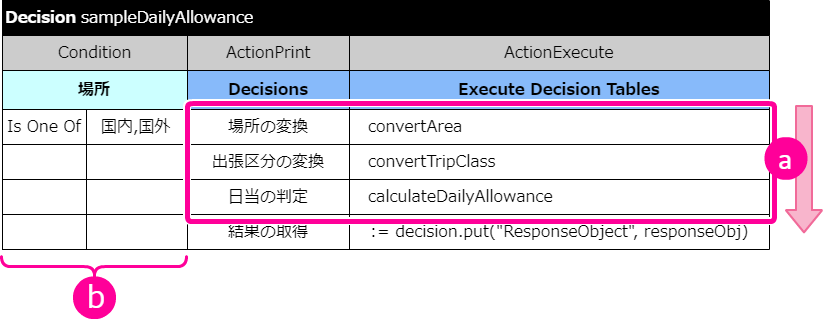 1つの Decision で実行対象の DecisionTable を複数記述できます。Decision では上から順に記述された DecisionTable の評価や処理を実行します。