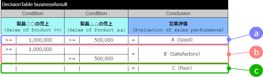 AND条件「製品○○の売上が100万円以上」と「製品△△の売上が50万円以上」の両方を満たす場合、営業評価として「A」を返却します。 OR条件「製品○○の売上が100万円以上」と「製品△△の売上が50万円以上」のいずれかを満たす場合、営業評価として「B」を返却します。 無条件(デフォルト条件)上の条件のどれにも合致しない場合、営業評価として「C」を返却します。