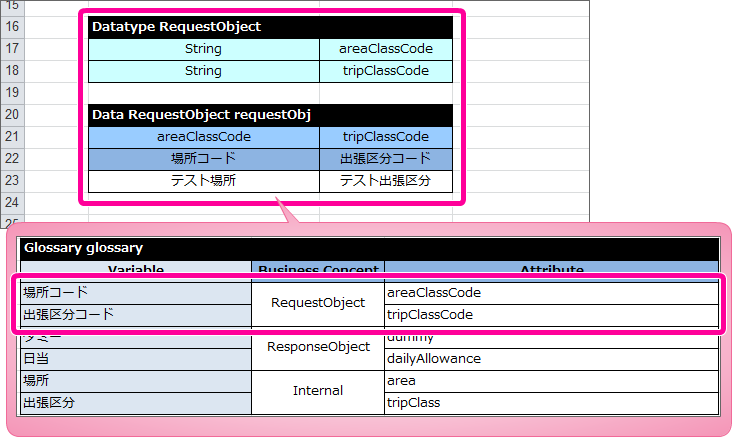 Data RequestObject requestObj areaClassCode tripClassCode 場所コード 出張区分コード テスト場所 テスト出張区分 ResponseObjectの Datatype と Data/Variable を以下のように定義してください。