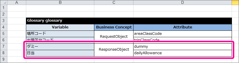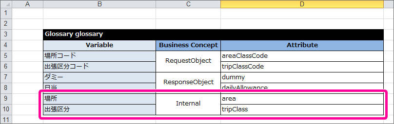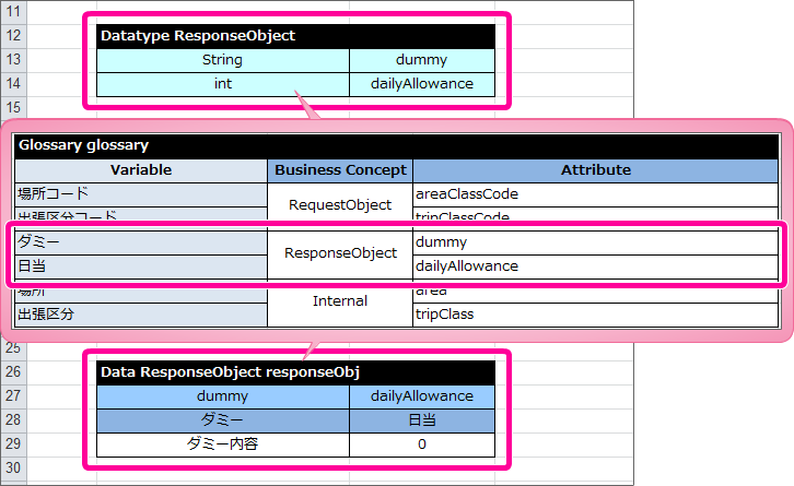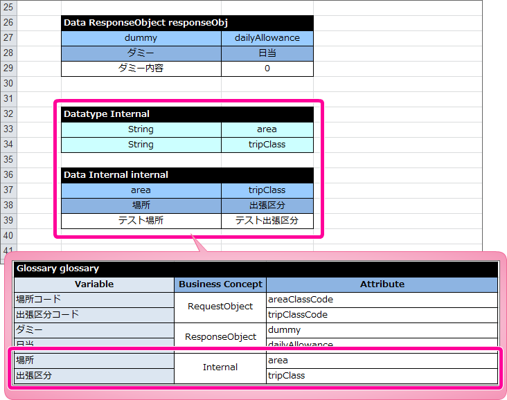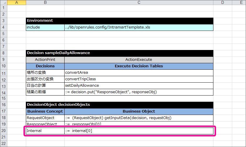 このうち、画面(フォーム)から OpenRules に受け渡される項目(場所コード、出張区分コード)を「RequestObject」の項目として定義してください。 続いて、 OpenRules から画面(フォーム)に返却する項目を「ResponseObject」として定義してください。ResponseObjectに含まれる項目は数値型の「日当(dailyAllowance)」のみですが、このまま定義すると OpenRules の制約( Datatype の「技術的な制約事項」参照 )で正しく実行できません。そのため、ダミー項目を定義した後に、日当を定義してください。Glossary には、以下のように定義します。 DecisionTable で扱っている項目のうち、RequestObjectとResponseObjectのどちらにも属さない項目は内部項目のオブジェクト(Internal)として定義します。この時点で定義していない「場所区分」「出張区分」について、以下のように定義してください。