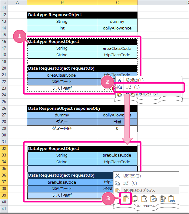 Data ResponseObject responseObj dummy dailyAllowance ダミー 日当 ダミー内容 0 同様にInternalの Datatype と Data/Variable を定義するために、先に作成したRequestObjectの定義を以下の手順でコピーしてください。