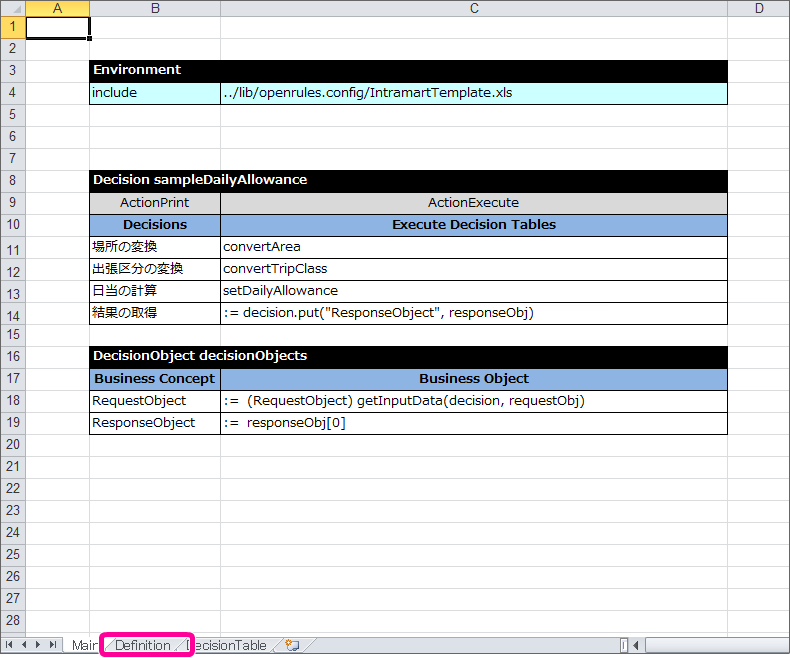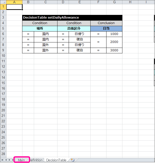 編集したExcelファイルを開きます。 「Main」タブをクリックして「Main」シートを表示してください。 Decision を表示してください。( DecisionTable を作成した時と同様に、シート上のコメントは不要であれば削除してください。) キーワード Decision から半角スペースを空けて「sampleDailyAllowance」と入力してください。 今回のハンズオンでは、1つの Decision で3つの DecisionTable を実行します。3つ分の DecisionTable を記述できるように間に2行追加してください。 最初に場所の DecisionTable を実行するための設定を行います。1行目の内容を以下の通りに変更してください。 次に出張区分の DecisionTable を実行するための設定を行います。以下の通り2行目に入力してください。 最後に日当計算の DecisionTable を実行するための設定を行います。以下の通り3行目に入力してください。 ここまでで、 DecisionTable の実行順を Decision で設定することができました。Excelファイルを保存し、次の手順に進みましょう。