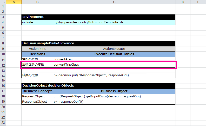 テーブル名キーワード DecisionTable から半角スペースを空けて「convertTripClass」と入力してください。 条件の項目の論理名「出張区分コード」と入力してください。 結果の項目の論理名「出張区分」と入力してください。 DecisionTable の明細には、以下の通りに「出張区分」のラジオボタンの表示値・送信値を入力してください。 これで、表示値と送信値を OpenRules でマッピングする表ができました。
