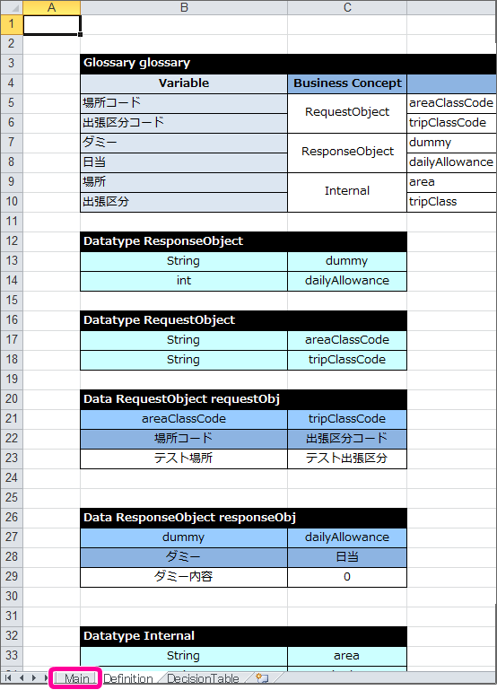 「Main」タブをクリックして「Main」シートを表示してください。 「Main」シートで DecisionObject を設定していきます。RequestObject、ResponseObjectのオブジェクトについては、テンプレートと同じ設定となっているため、設定は不要です。RequestObject、ResponseObjectの下にInternalの設定用に1行追加してください。 追加した行には、以下のように設定してください。