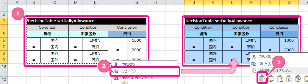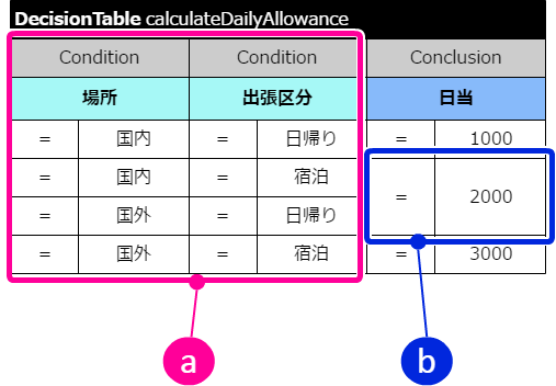 最初に場所(国内・国外)と出張区分(日帰り・宿泊)から日当を計算する DecisionTable を作成しましょう。