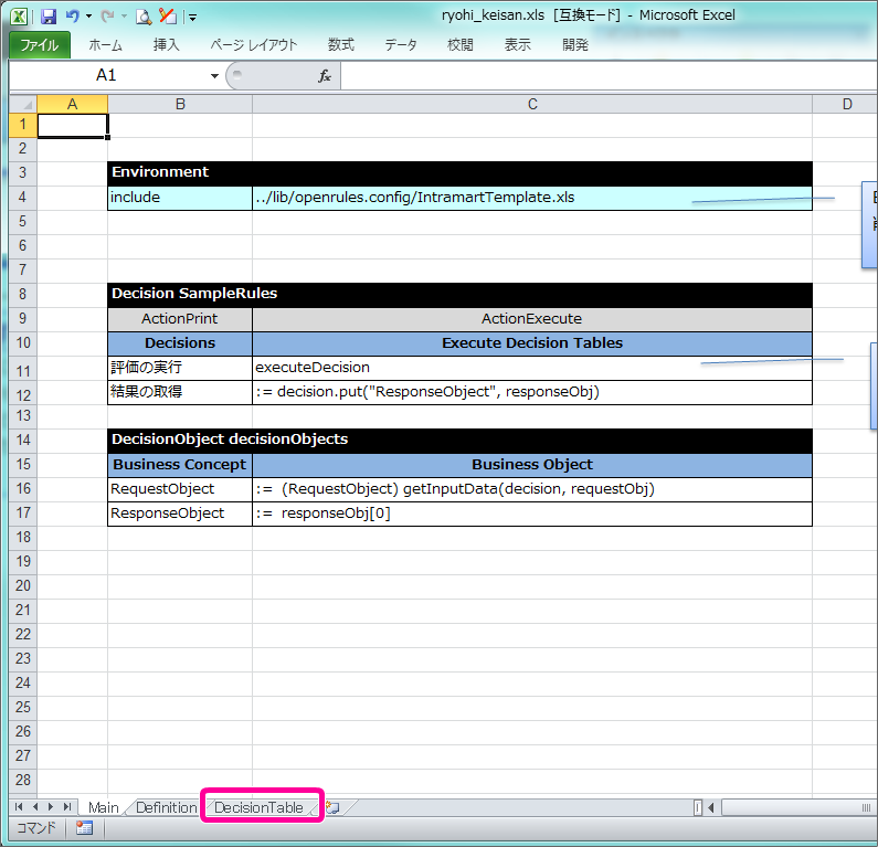 編集中のExcelファイルの「DecisionTable」シートを表示してください。 テンプレートには、説明が添付されていますので、枠で囲まれた部分を削除してください。