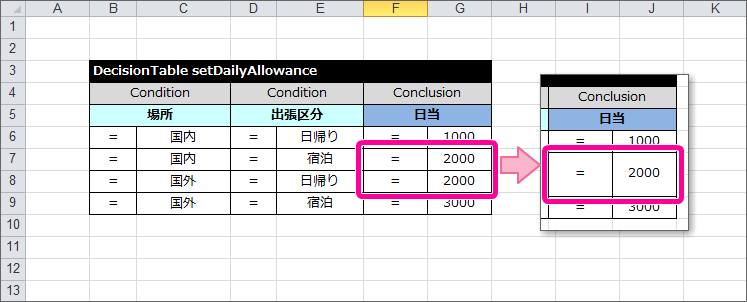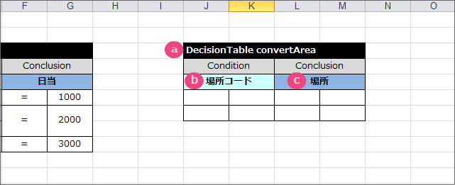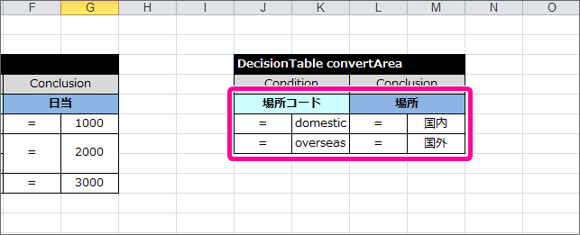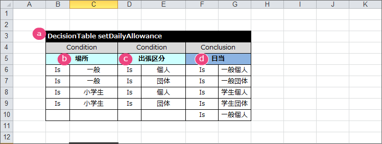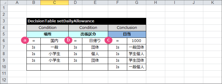 テーブル名キーワード DecisionTable から半角スペースを空けて「setDailyAllowance」と入力してください。 条件の項目の論理名(1)「場所」と入力してください。 条件の項目の論理名(2)「出張区分」と入力してください。 結果の項目の論理名「日当」と入力してください。 これで、 DecisionTable の項目が設定できましたので、各行に条件と評価を入力していきましょう。