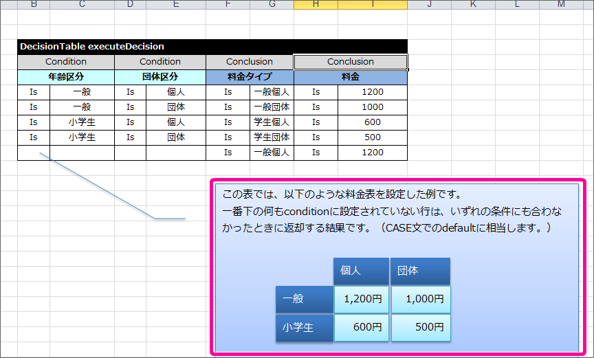 - 「AND条件」は、 DecisionTable の同じ行に異なる項目に対する条件の基準値を記述することで表現することができます。