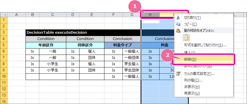 - 不要な Conclusion の列(図中ではH列とI列)をドラッグして選択状態にし、右クリックしてください。