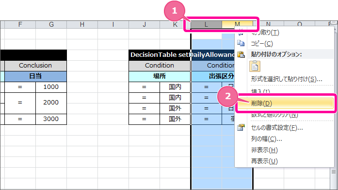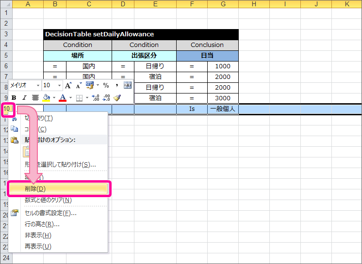 まずは、場所が「国内」、出張区分が「日帰り」の条件と日当「1,000円」を設定します。以下の通り、1行目の条件・評価を入力してください。 続いて、場所区分が「国内」、出張区分が「宿泊」の条件と日当「2,000円」を設定します。以下の通り、2行目の条件・評価を入力してください。 場所区分が「国外」、出張区分が「日帰り」の条件と日当「2,000円」を設定します。以下の通り、3行目の条件・評価を入力してください。 場所区分が「国外」、出張区分が「宿泊」の条件と日当「3,000円」を設定します。以下の通り、4行目の条件・評価を入力してください。 5行目については、不要な行のため、対象の行の上(図中では10行目)で右クリックし、削除をクリックしてください。 作成した DecisionTable を確認すると、結果に「日当」の「2,000円」が2回登場しており、対応する条件2つのどちらかを満たす、つまりOR条件で設定する必要があります。OpenRules では、OR条件を設定するには、セルを結合する必要があるため、この日当の演算子・値のセルを結合してください。 これで、日当を計算する DecisionTable が完成しましたので、一度ファイルを保存しましょう。