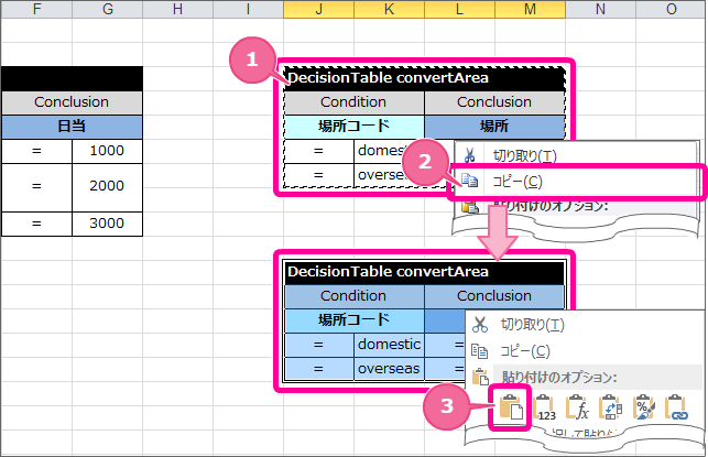 以下の手順で作成済みの DecisionTable 「convertArea」をコピーして新しい DecisionTable を作成してください。 DecisionTable のテーブル名と項目名を以下の通りに入力してください。