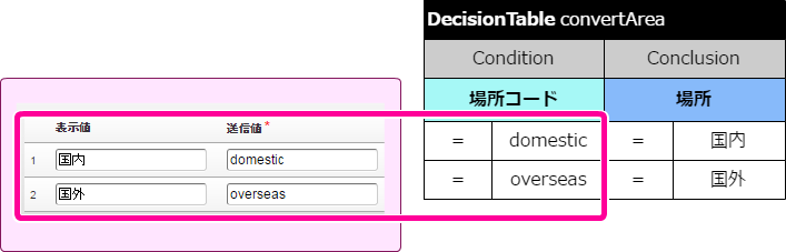 テーブル名キーワード DecisionTable から半角スペースを空けて「convertArea」と入力してください。 条件の項目の論理名「場所コード」と入力してください。 結果の項目の論理名「場所」と入力してください。 DecisionTable の明細には、以下の通りに「場所」のラジオボタンの表示値・送信値を入力してください。 これで場所のマッピング DecisionTable が作成できましたので、引き続き出張区分を作成していきましょう。