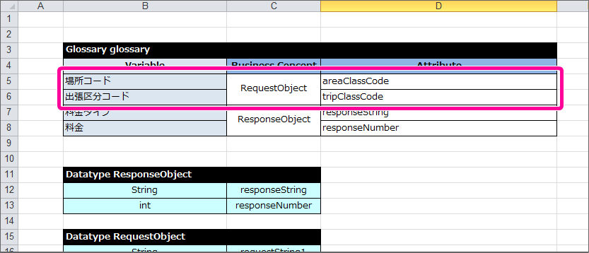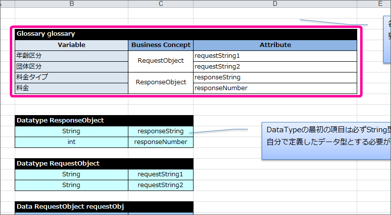 同じ「Definition」シートのRequestObjectの Datatype と Data/Variable を以下のように定義してください。