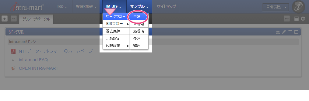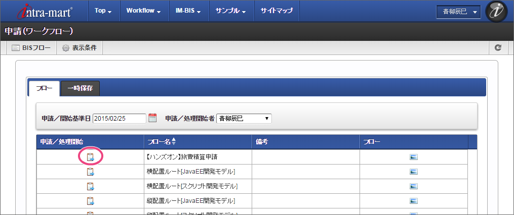 「BIS担当者」ロールを付与したユーザでログインしましょう。(このマニュアルでは、「青柳辰巳」(ユーザコード:aoyagi)でログインします。) 上部のメニューの「 IM-BIS 」→「ワークフロー」の順にマウスを重ねてから「申請」をクリックしてください。 「【ハンズオン】旅費精算申請」の「申請/処理開始」をクリックしてください。