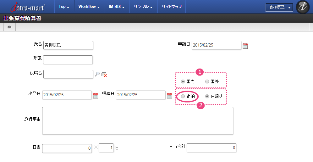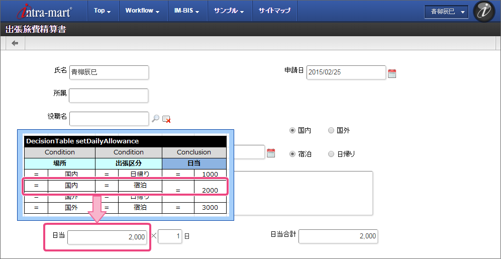 申請画面で(1)場所、(2)宿泊区分の値を変更してみましょう。(例として、ここでは「宿泊区分」を「宿泊」に変更します。) OpenRules で設定した通りに、日当の金額が変わることが確認できました。また、日当の金額の変更に応じて、日当合計も正しく計算されています。 この後は、申請や承認を行ってみてください。