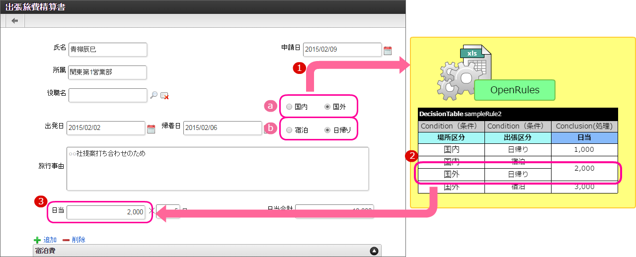 (a)「場所区分」(国内/国外)、(b)「出張区分」(宿泊/日帰り)を入力すると、ルールが実行される